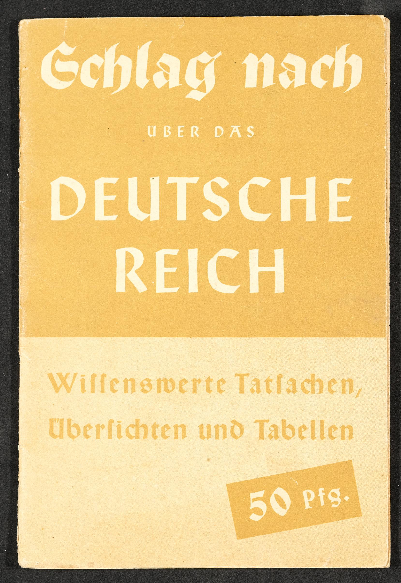 | Beschreibung | Informationsheft "Schlag nach über das Deutsche Reich"; Verlag Bibliographisches Institut Leipzig, 32 Seiten. Es beschreibt die nationalsozialistische Sicht auf das Deutsche Reich mit Propaganda und Ideologien in den Themen Geografie, Infrastruktur, Regierung, nationalsozialistische Gesetzgebung und Rassenideologie, Medien im Deutschen Reich und Geschichte. |
