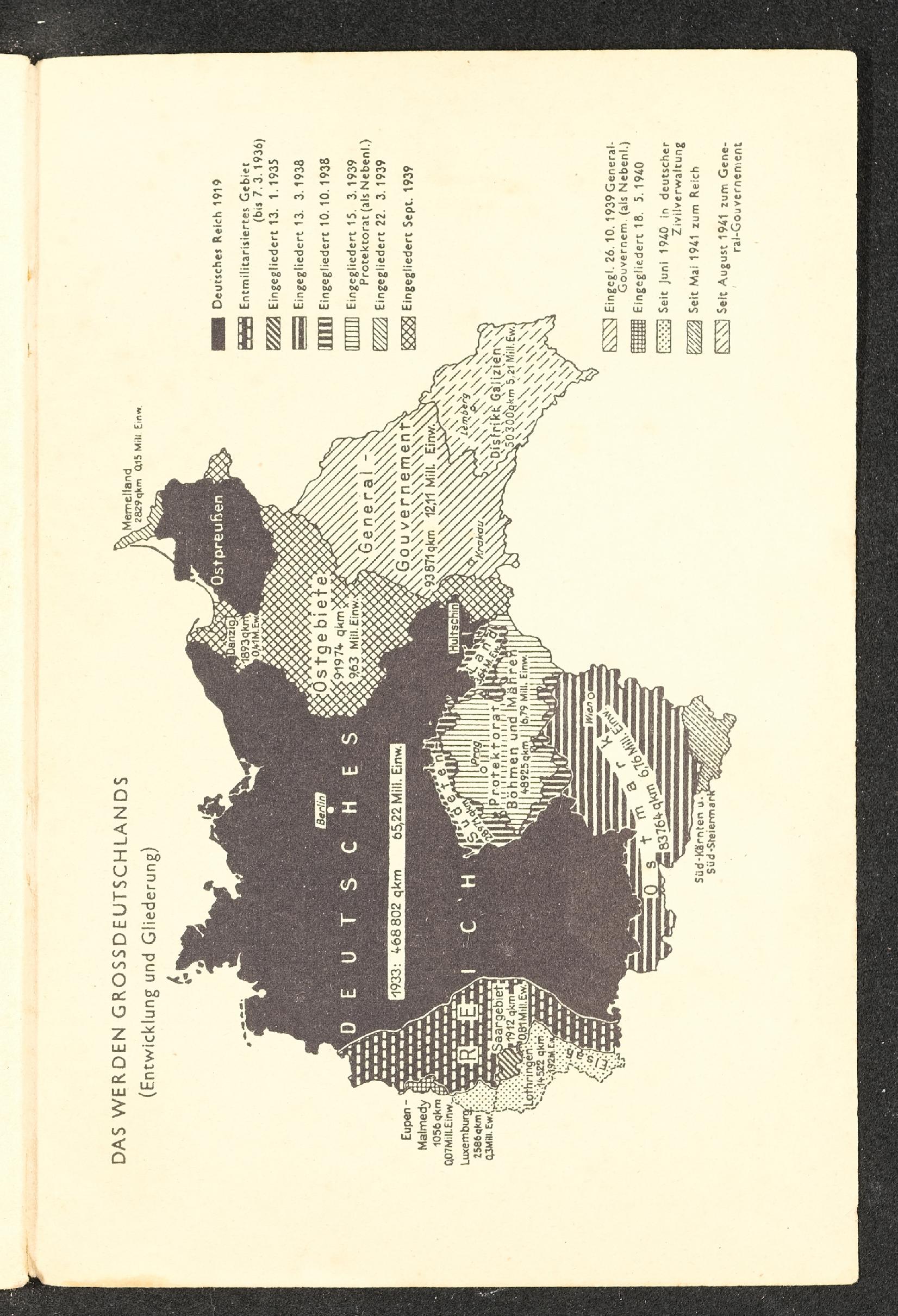 | Beschreibung | Informationsheft "Schlag nach über das Deutsche Reich"; Verlag Bibliographisches Institut Leipzig, 32 Seiten. Es beschreibt die nationalsozialistische Sicht auf das Deutsche Reich mit Propaganda und Ideologien in den Themen Geografie, Infrastruktur, Regierung, nationalsozialistische Gesetzgebung und Rassenideologie, Medien im Deutschen Reich und Geschichte. |