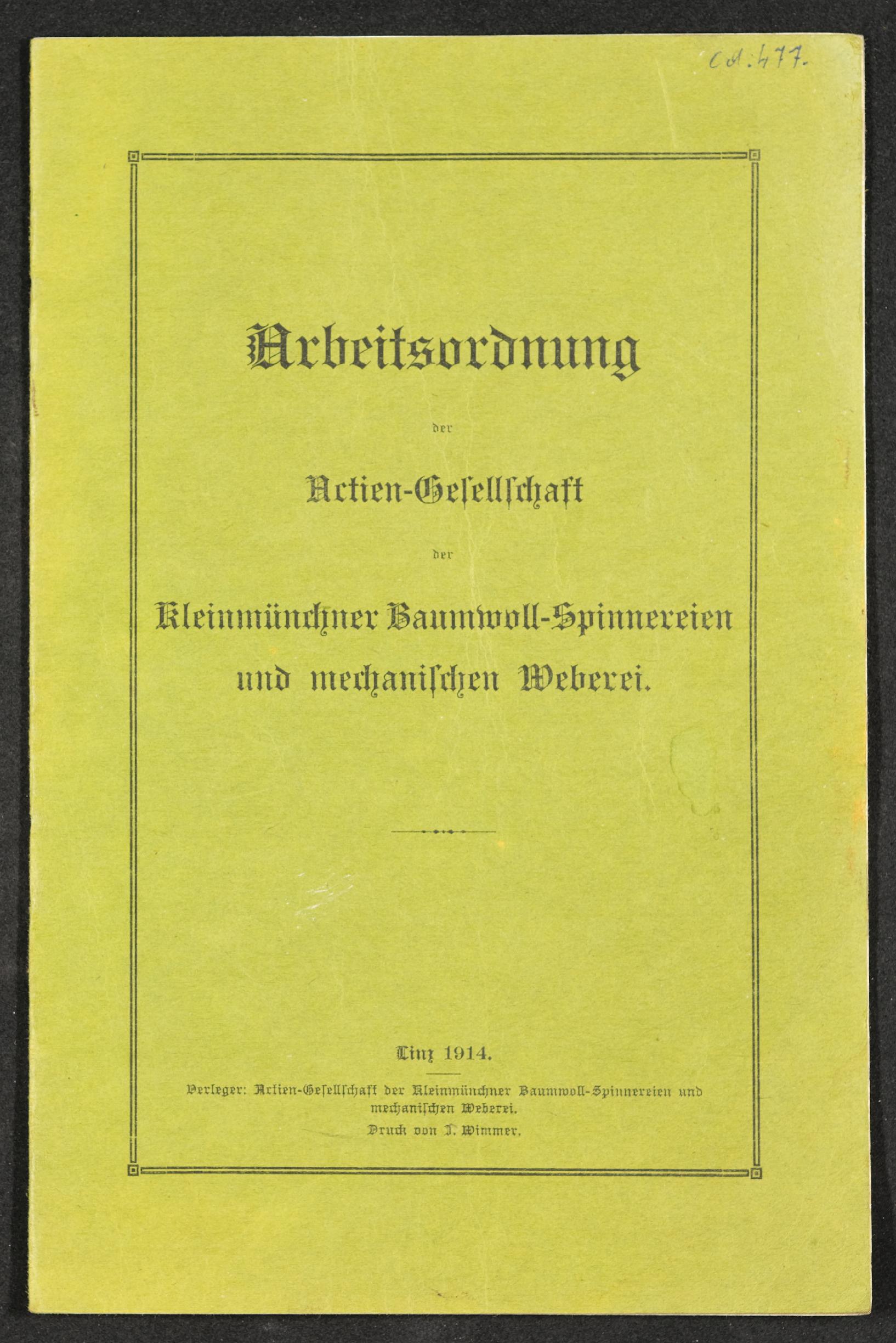 | Beschreibung | Arbeitsordnung der Actien-Gesellschaft der Kleinmünchner Baumwoll-Spinnereien und mechanischen Weberei, Linz 1914 |