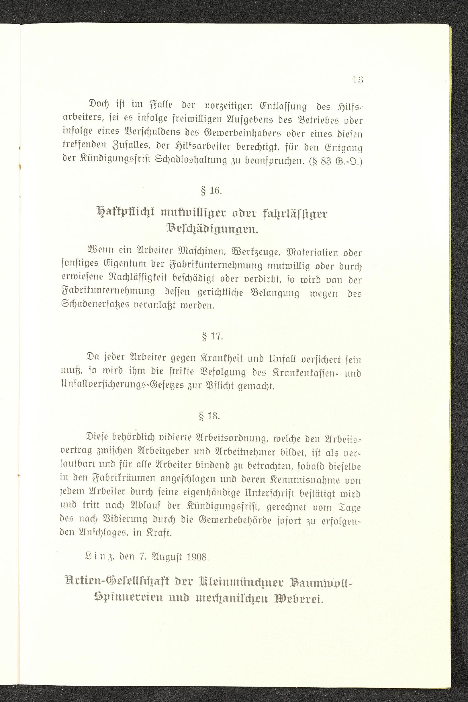 | Beschreibung | Arbeitsordnung der Actien-Gesellschaft der Kleinmünchner Baumwoll-Spinnereien und mechanischen Weberei, Linz 1914 |