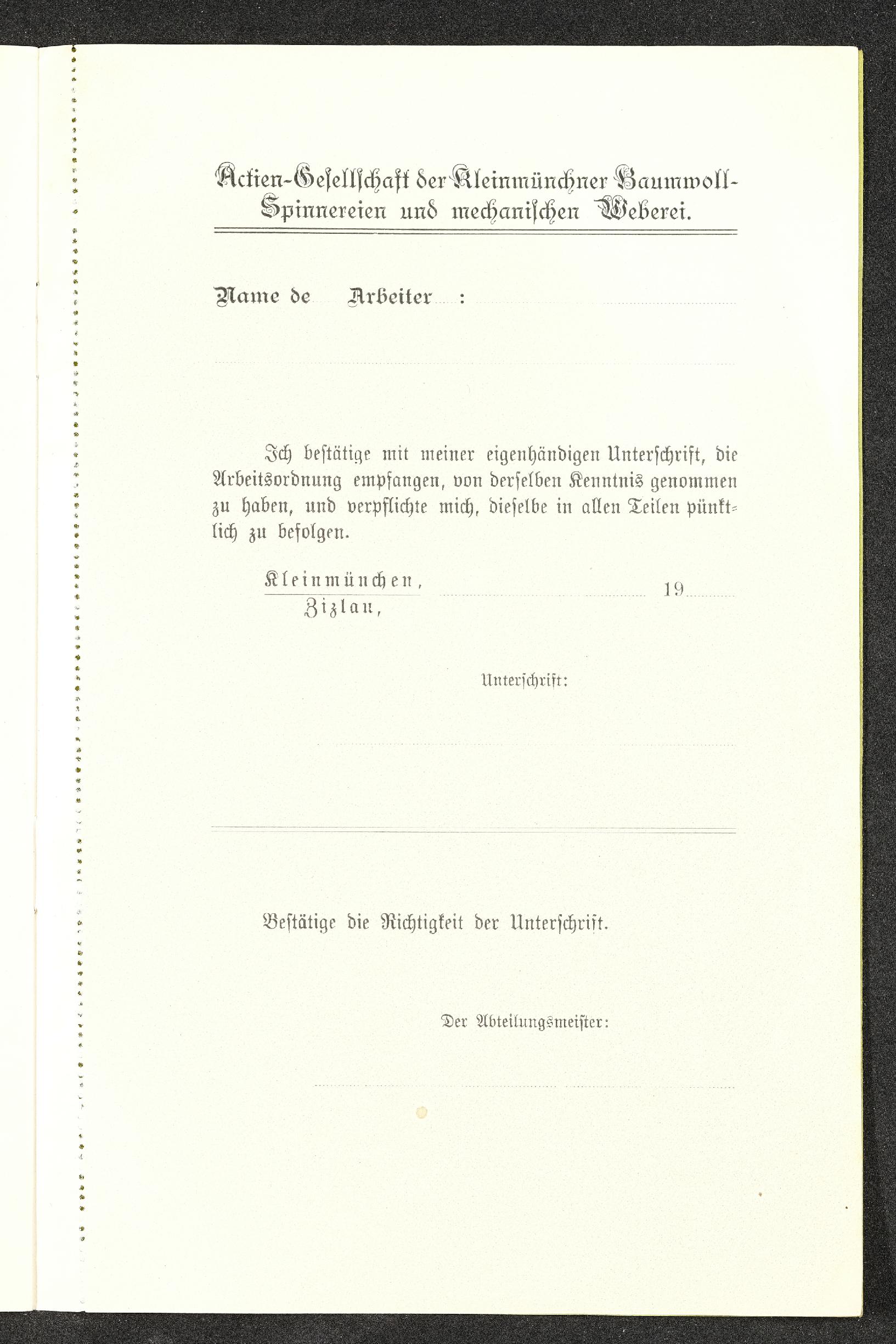 Arbeitsordnung der Actien-Gesellschaft der Kleinmünchner Baumwoll-Spinnereien und mechanischen Weberei