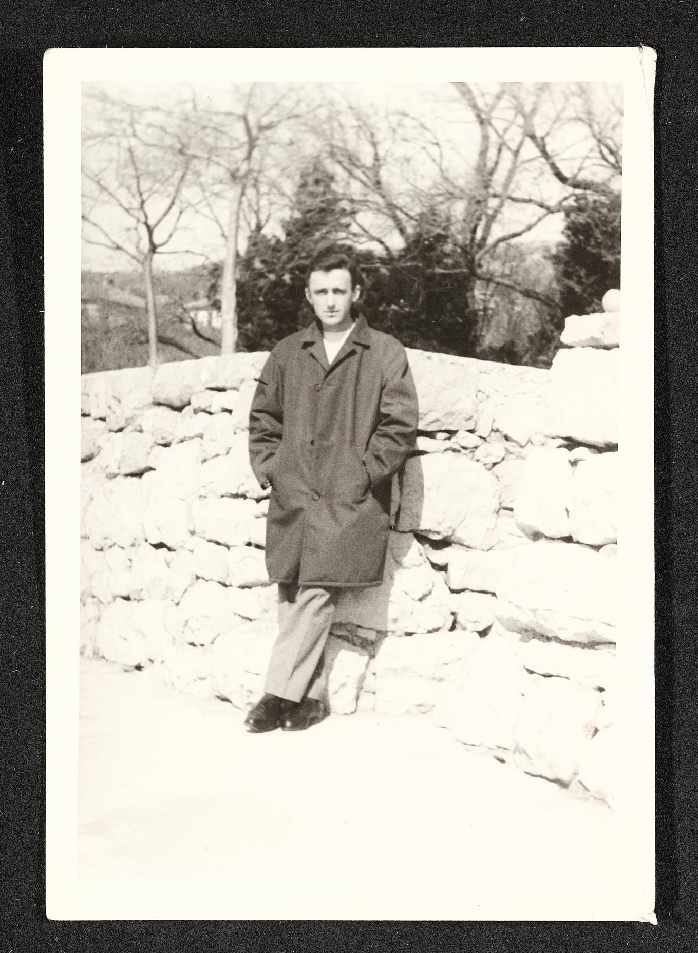 Mann an Steinmauer