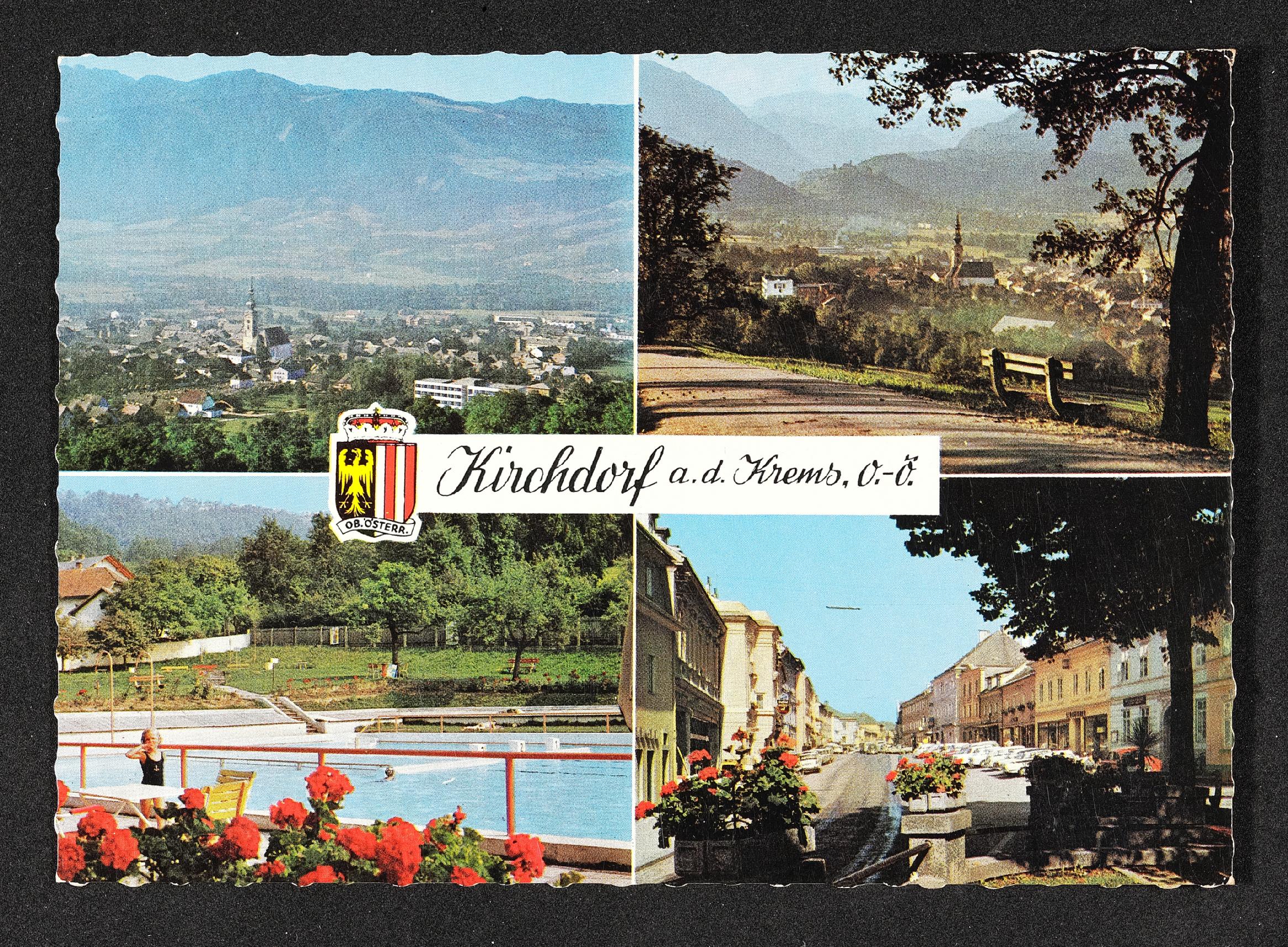 | Beschreibung | Ansichtskarte "Kirchdorf an der Krems" an Veronika Erntl mit vier Bildern: zwei Blicke über den Ortskern aus verschiedenen Perspektiven oberhalb des Ortes, ein Bild des Freibades und eine Ansicht des Ortszentrums. Persönliche Nachricht der Eltern an Veronika Erntl |