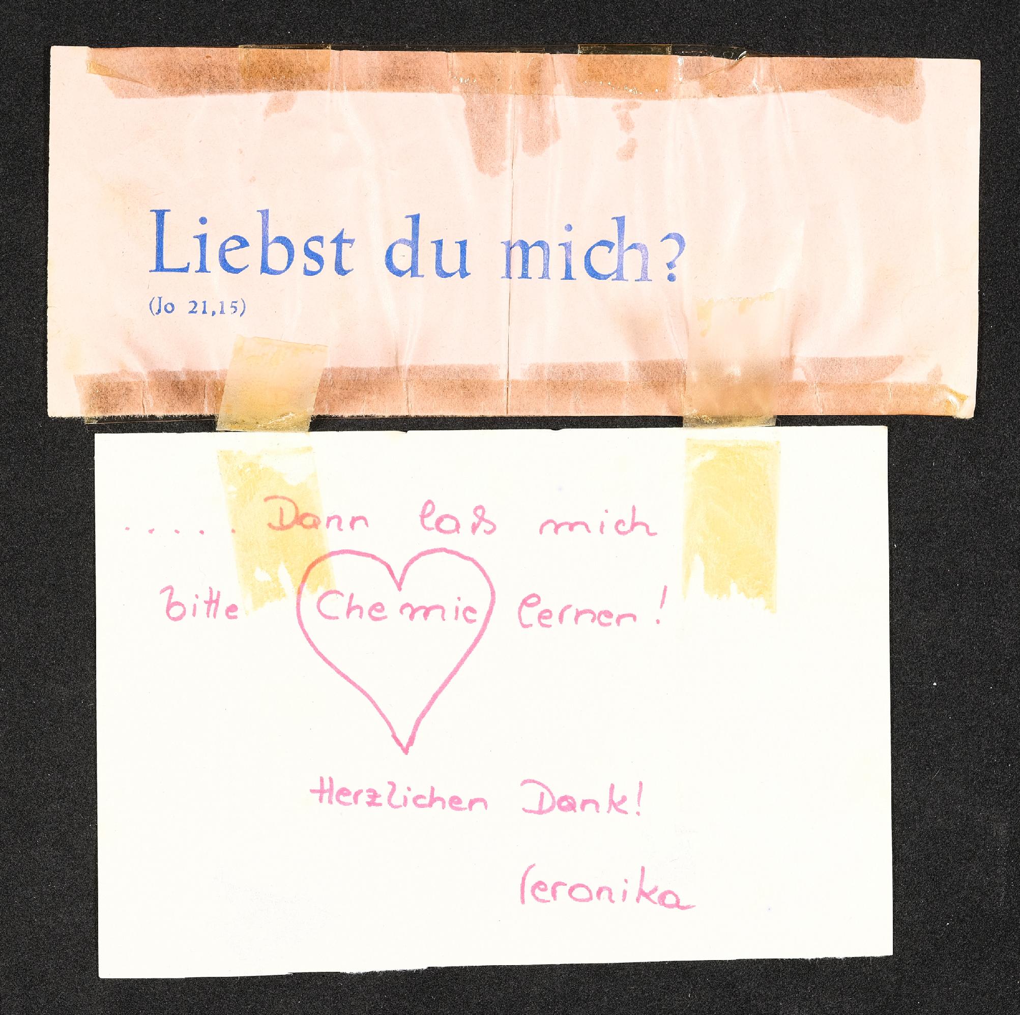 | Beschreibung | Notiz von Veronika Erntl an eine Person auf zwei zusammengeklebten Zetteln: Druck: "Liebst du mich (jo 21,15)" Handschrift: "Dann laß mich bitte Chemie lernen! Herzlichen Dank! Veronika". |