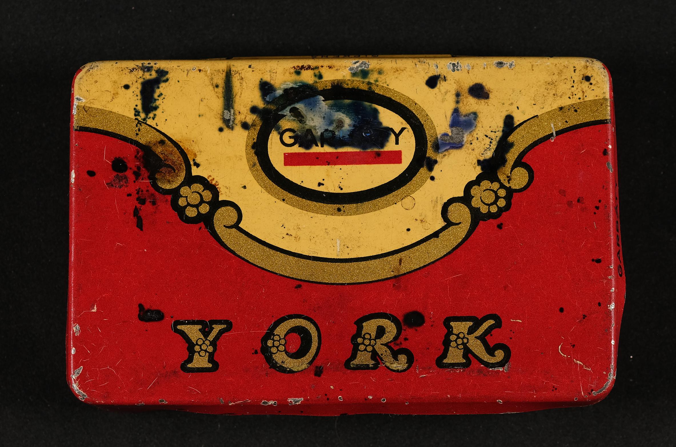 | Beschreibung | Zigarettendose aus Blech, Garbaty York, Außenansicht, Innenansicht |