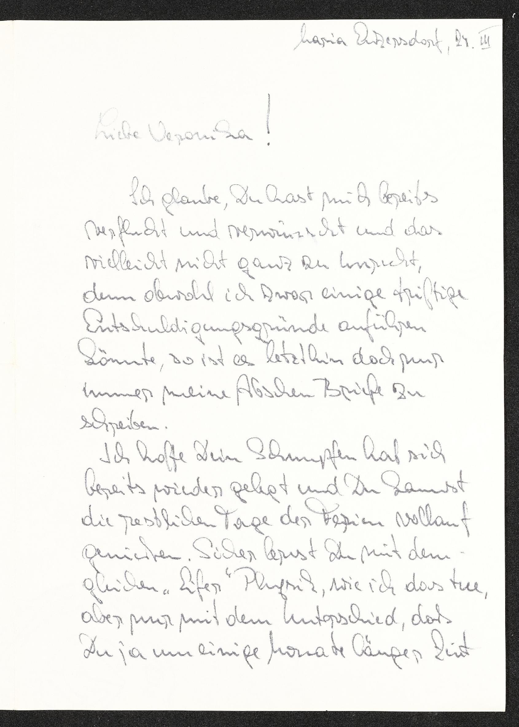 | Beschreibung | Briefbogen-Vorderseite des Briefes von H. Altenburger an Veronika Erntl, in dem über aktuelle Lebensereignisse und eine anstehende Physik-Prüfung berichtet wird. Die Rückseite des Briefbogens ist nicht beschriftet. Dem Brief beiliegend eine medizinische Tabelle mit persönlicher Beschriftung. |