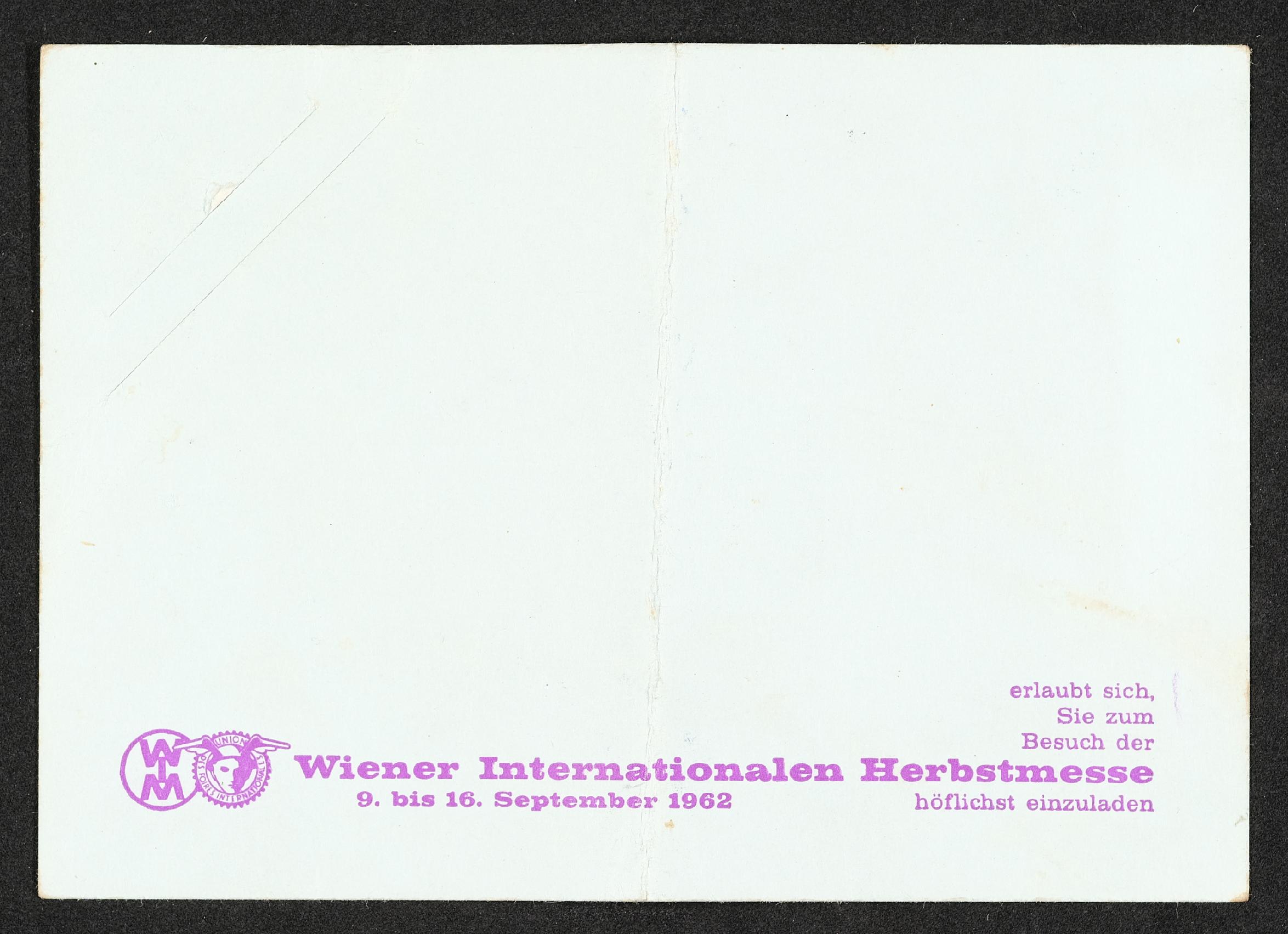 | Beschreibung | Faltbare Karte mit der Einladung zur Wiener Internationalen Herbstmesse von 9. bis 16. September 1962. Auf der Rückseite ist ein handschriftlicher Vermerk. |