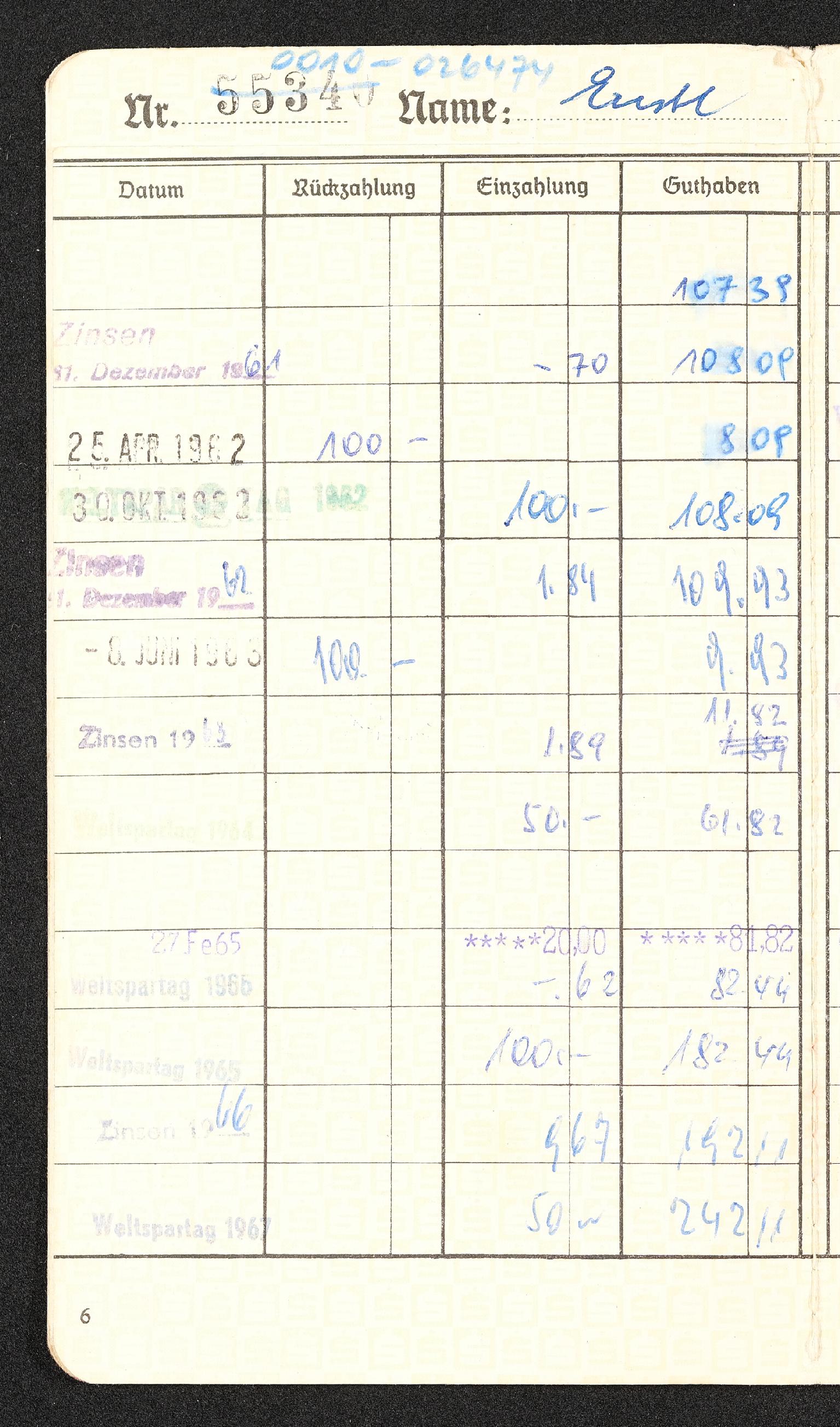 | Beschreibung | Seite 6 des Sparkassenbuches der Sparkasse Kirchdorf an der Krems von Veronika Erntl. Einträge von 1958 bis 1974. |