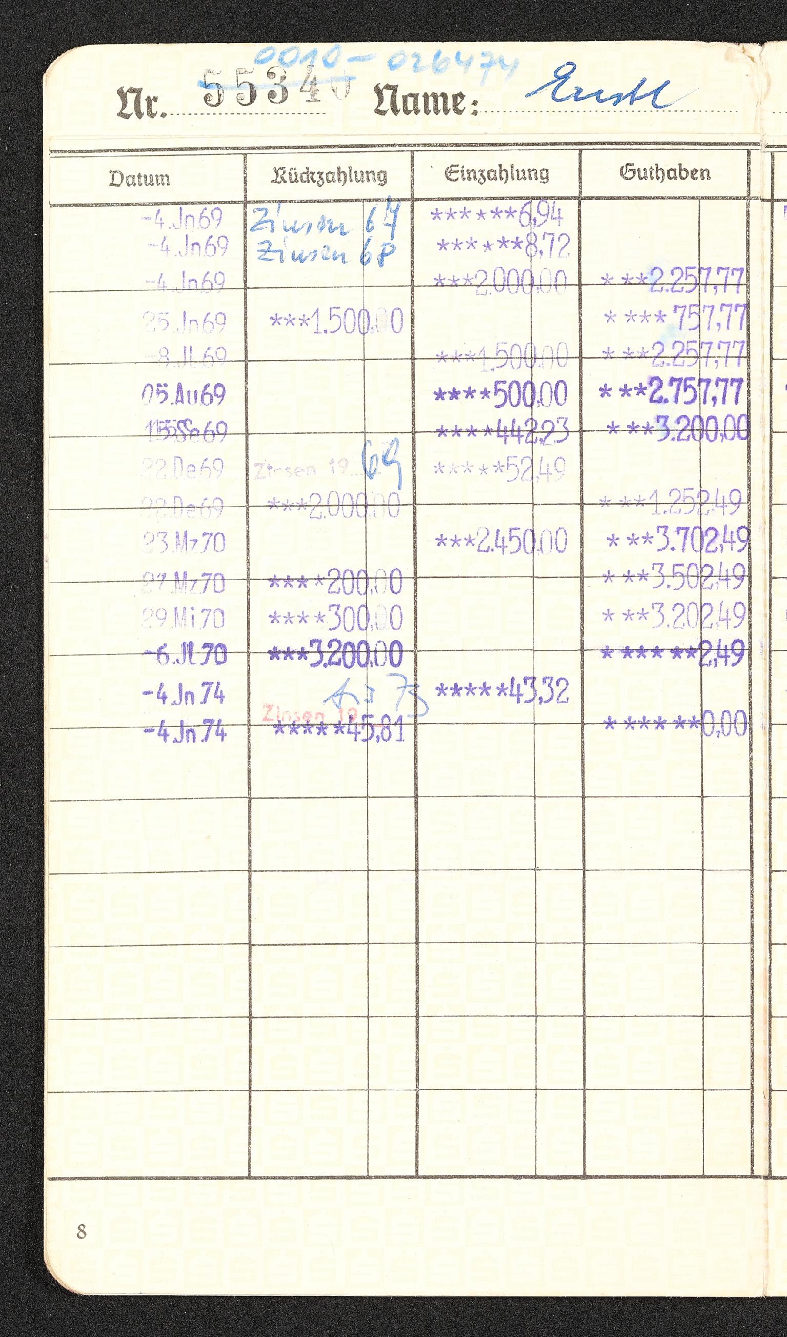 | Beschreibung | Seite 8 des Sparkassenbuches der Sparkasse Kirchdorf an der Krems von Veronika Erntl. Einträge von 1958 bis 1974. |