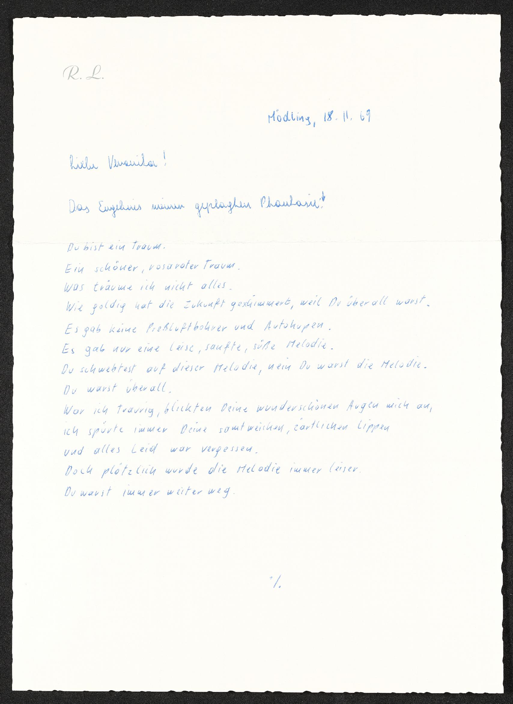 | Beschreibung | Persönlicher Brief von Rainhart Lichtenegger an Veronika Erntl, hauptsächlich bestehend aus einem selbst verfassten Liebesgedicht. Verfasst in Mödling am 18. November 1969. |