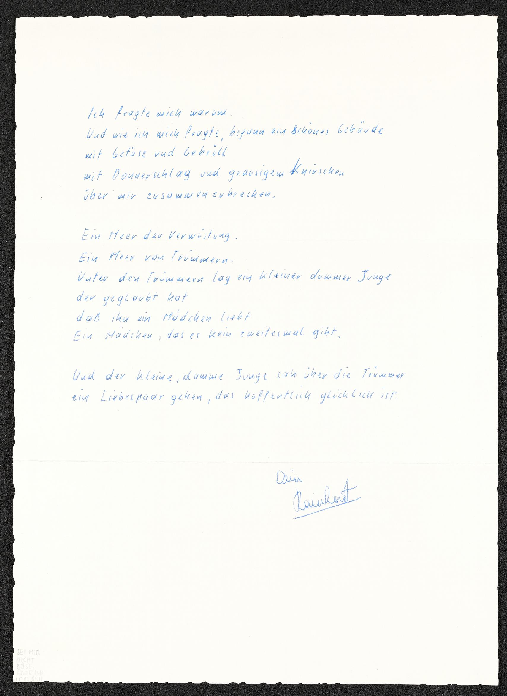 | Beschreibung | Persönlicher Brief von Rainhart Lichtenegger an Veronika Erntl, hauptsächlich bestehend aus einem selbst verfassten Liebesgedicht. Verfasst in Mödling am 18. November 1969. |
