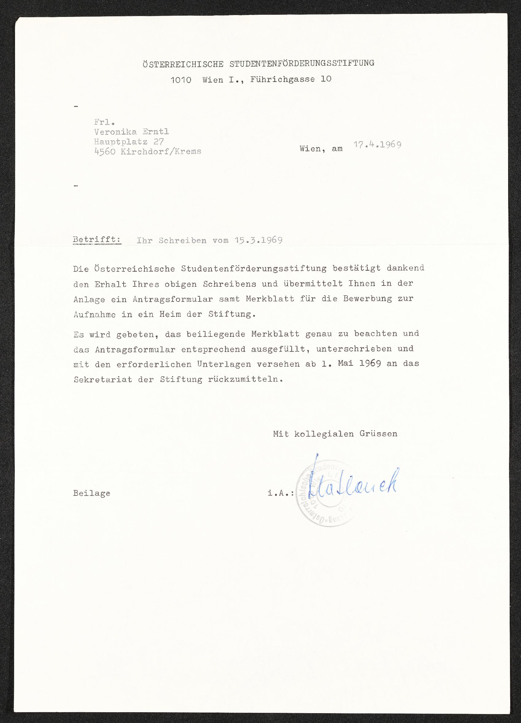 | Beschreibung | Schreiben der Österreichischen Studentenförderungsstiftung vom 17. April 1969 an Veronika Erntl bezüglich ihres Schreibens vom 15. März 1969. Übersendet wird ein Antragsformular für eine Bewerbung zur Aufnahme in ein Heim der Stiftung und ein Merkblatt der einzureichenden Dokumente und Unterlagen. Das Antragsformular ist nicht mehr in dem Brief enthalten. |