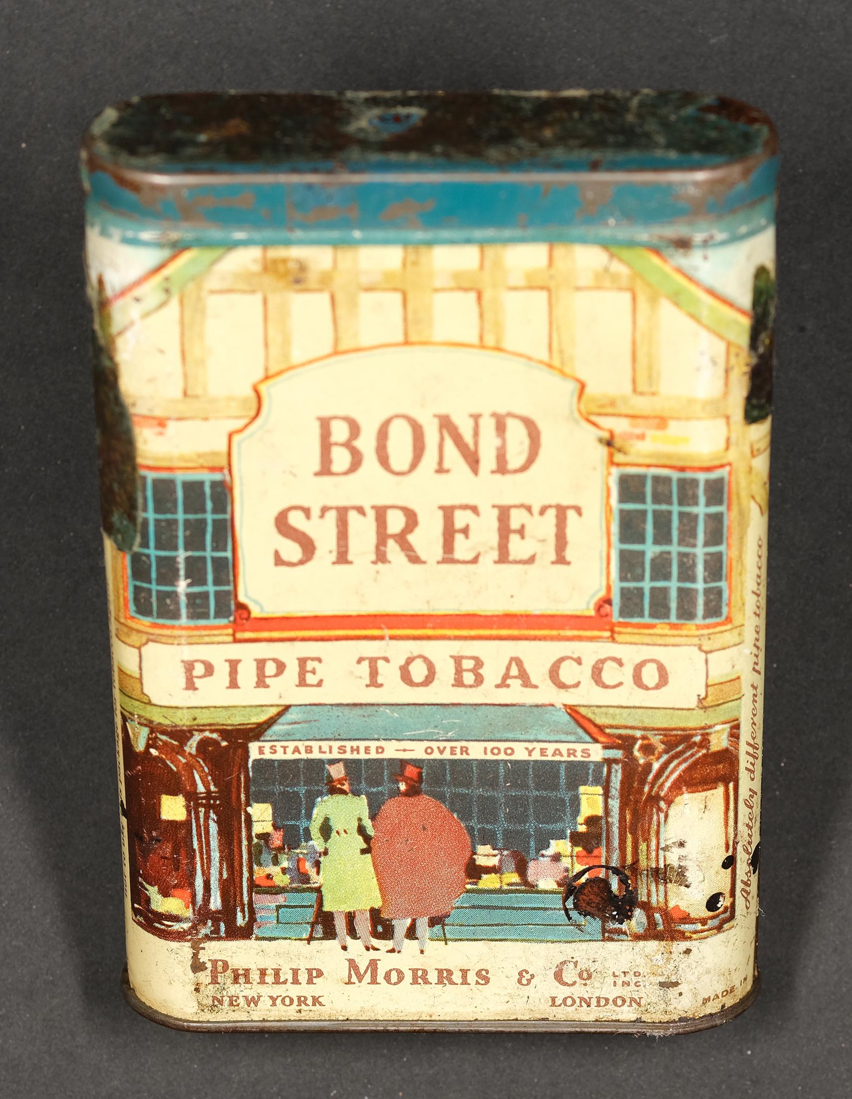 | Beschreibung | Pfeifentabakdose aus Blech der Fima Philip Morris & Co Bond Street Pipe Tobacco |