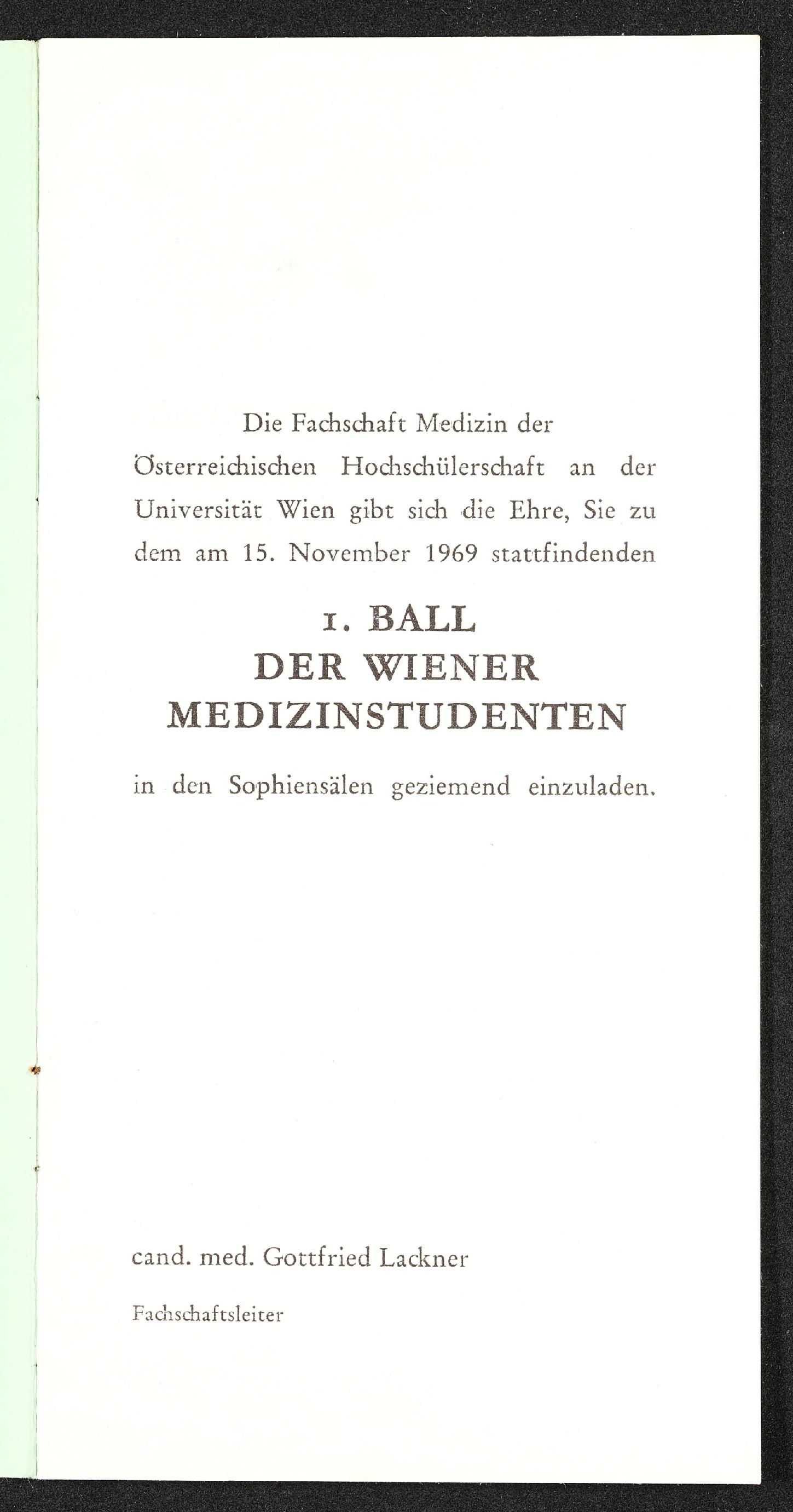 | Beschreibung | Einladung zum 1. Ball der Medizinstudenten an der Universität Wien am 15. November 1969, Einladung durch Fachschaftsleiter cand. med. Gottfried Lackner |