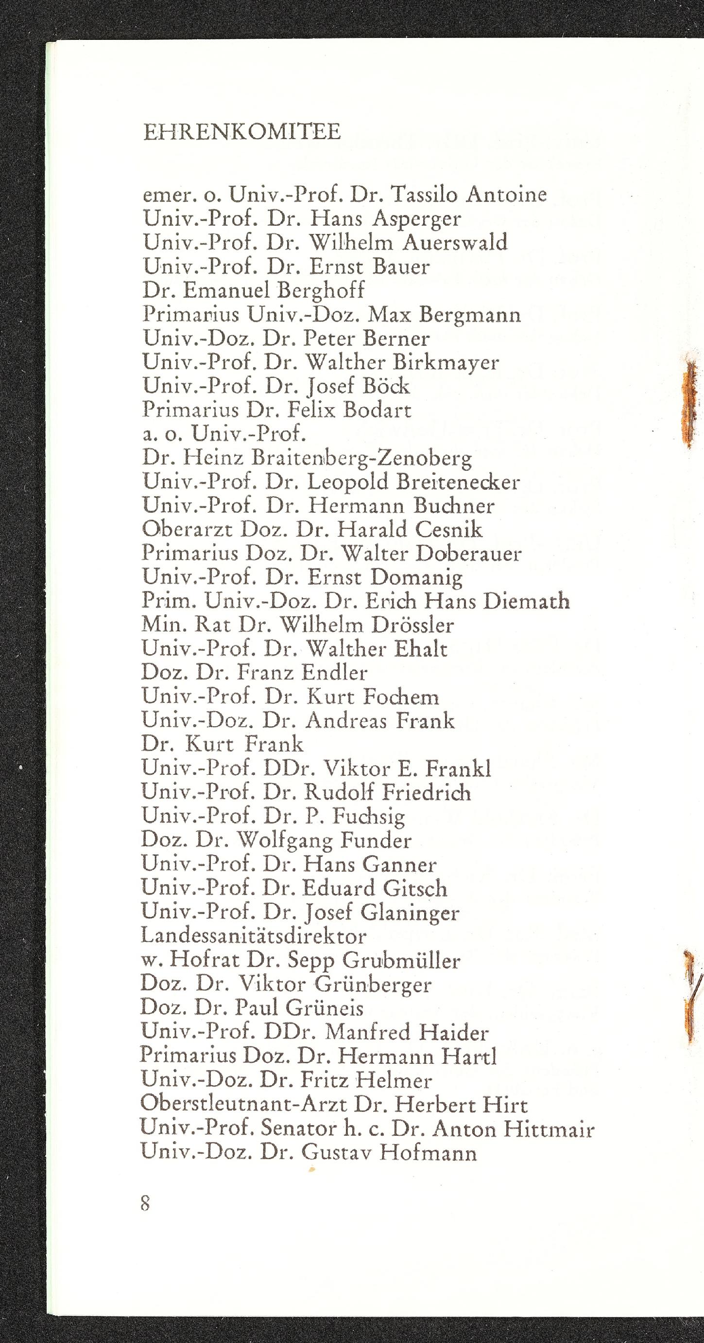 | Beschreibung | Einladung zum 1. Ball der Medizinstudenten an der Universität Wien am 15. November 1969, Seite 8, Ehrenkomitee |
