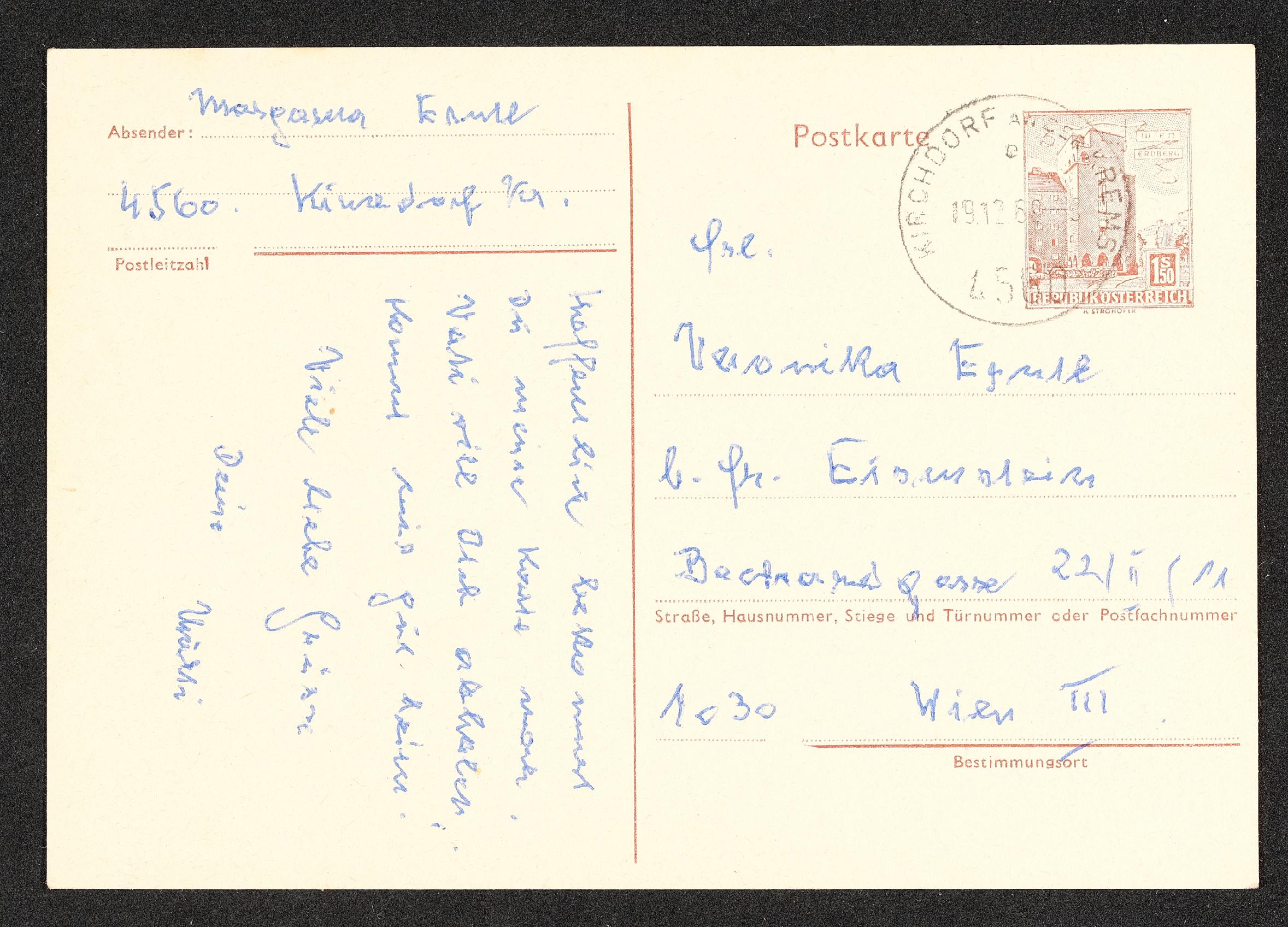 | Beschreibung | Postkarte von den Eltern an Veronika Erntl, 19. Dezember 1969 |