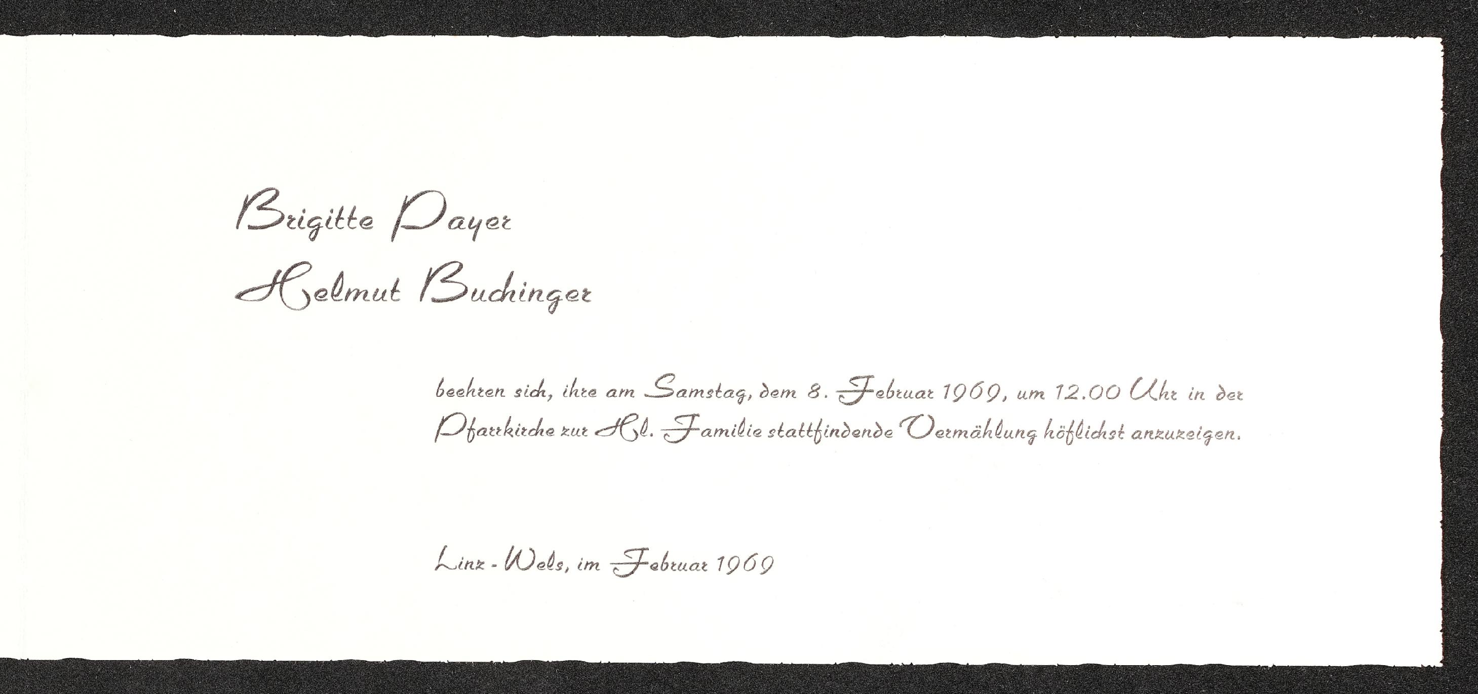 | Beschreibung | Einladung an Veronika Erntl von Brigitte Payer und Helmut Buchinger, Bekanntgabe (Einladung zur) Vermählung am 8. Februar 1969 |