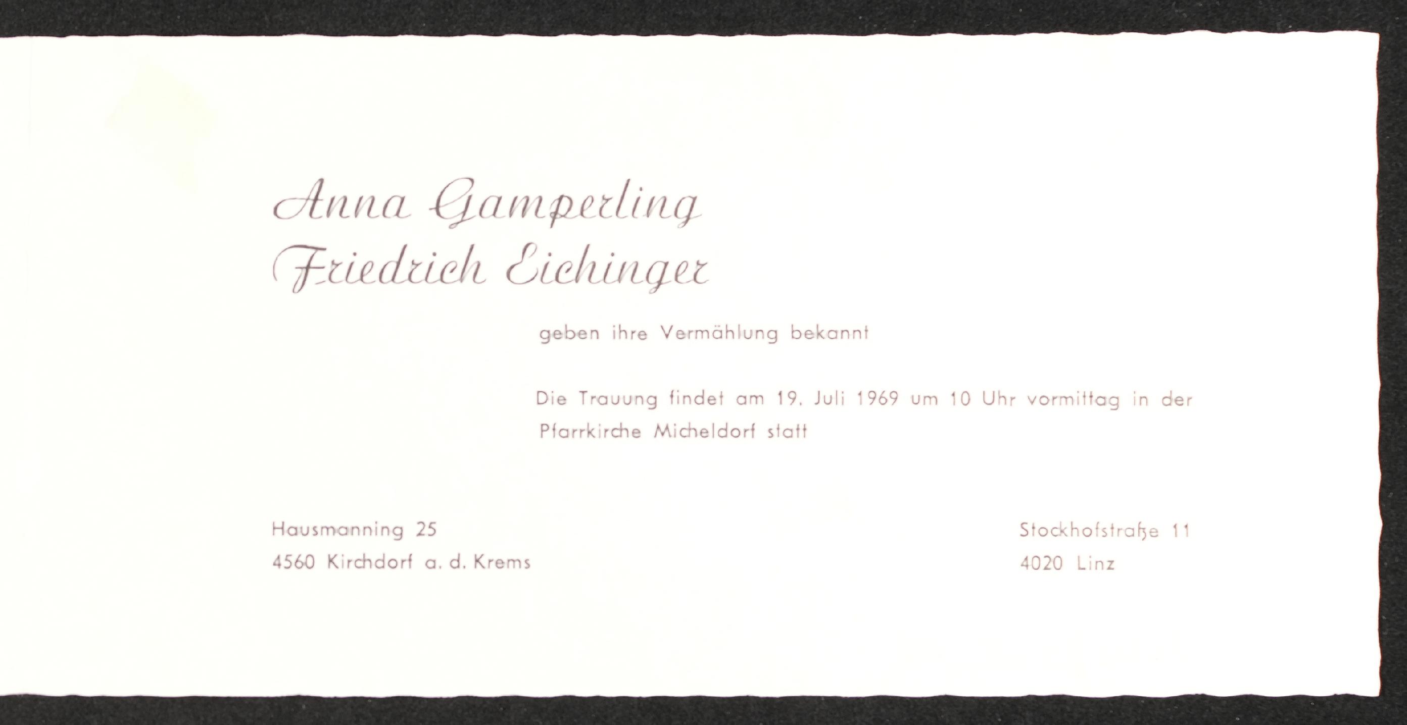 | Beschreibung | Einladung an Veronika Erntl von Anna Gamperling und Friedrich Eichinger, Bekanntgabe (Einladung zur) Vermählung am 19. Juli 1969 |