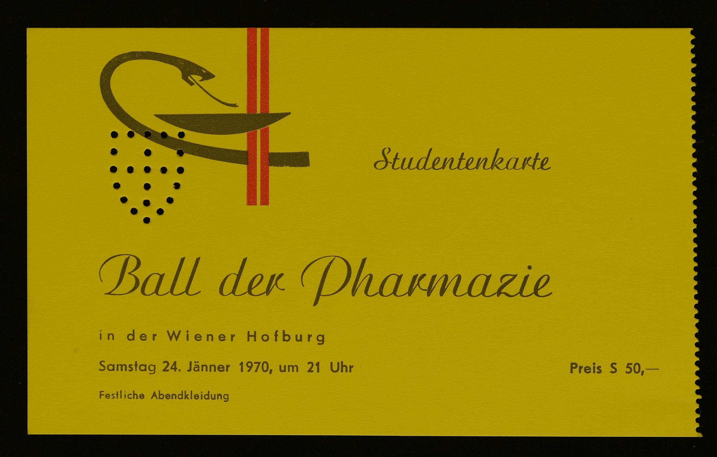 | Beschreibung | Eintrittskarte der Medizinstudentin Veronika Erntl für den Ball der Pharmazie am 24. Jänner 1970 in der Wiener Hofburg |
