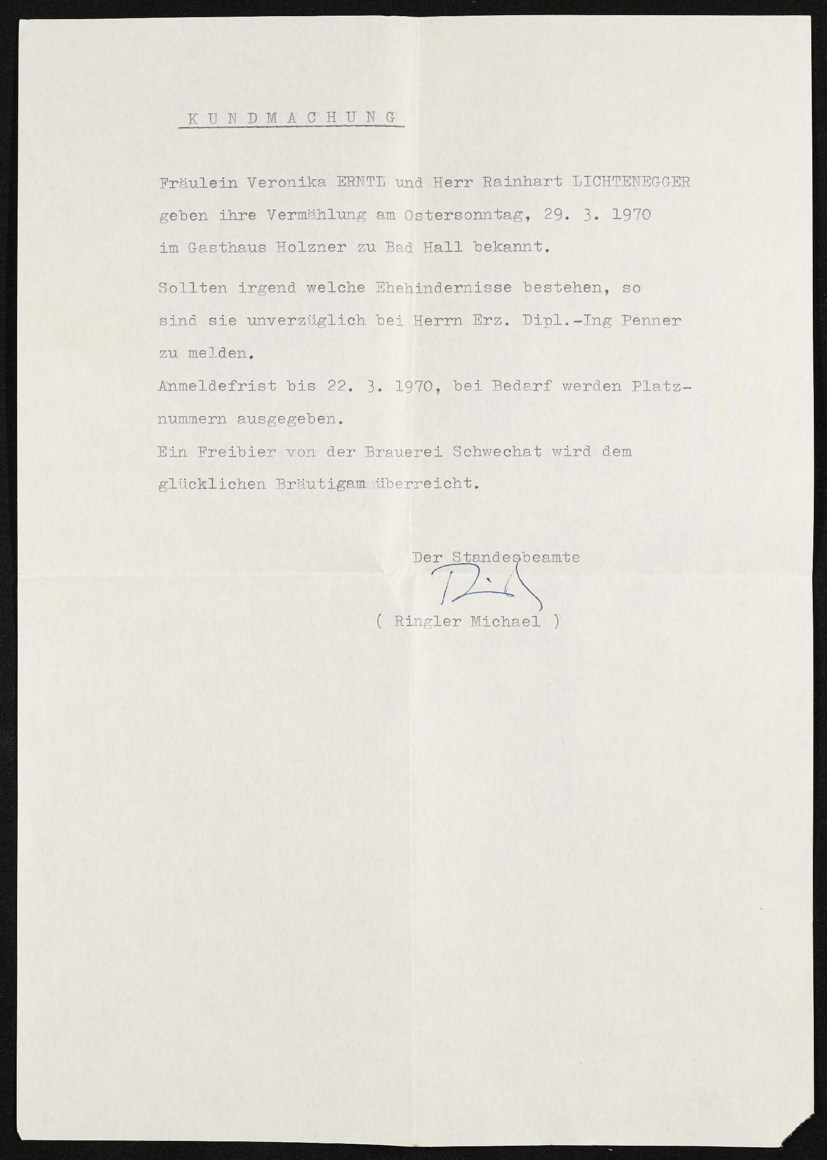 | Beschreibung | Amtliche Kundmachung der Vermählung von Veronika Erntl und Rainhart Lichtenegger am Ostersonntag, 29. März 1970 |