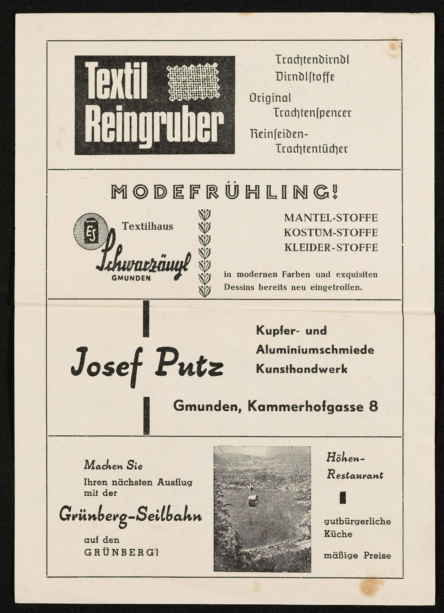 | Beschreibung | Werbung auf der Rückseite des Flugzettels "Liebstatt=Sonntag" in Gmunden mit persönlicher Nachricht an Veronika Erntl vom 8. März 1970 |