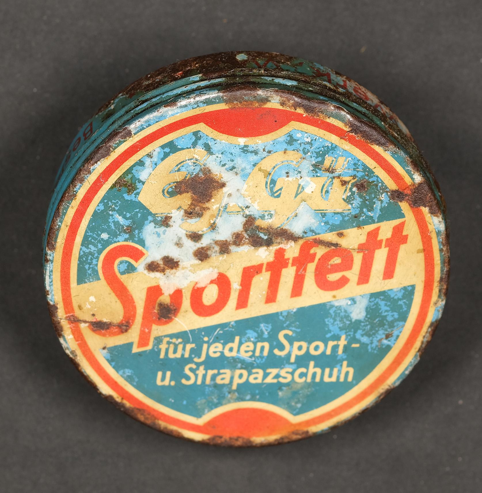 | Beschreibung | Blechdose, Sportfett für Schuhe der Firma EG.GÜ |