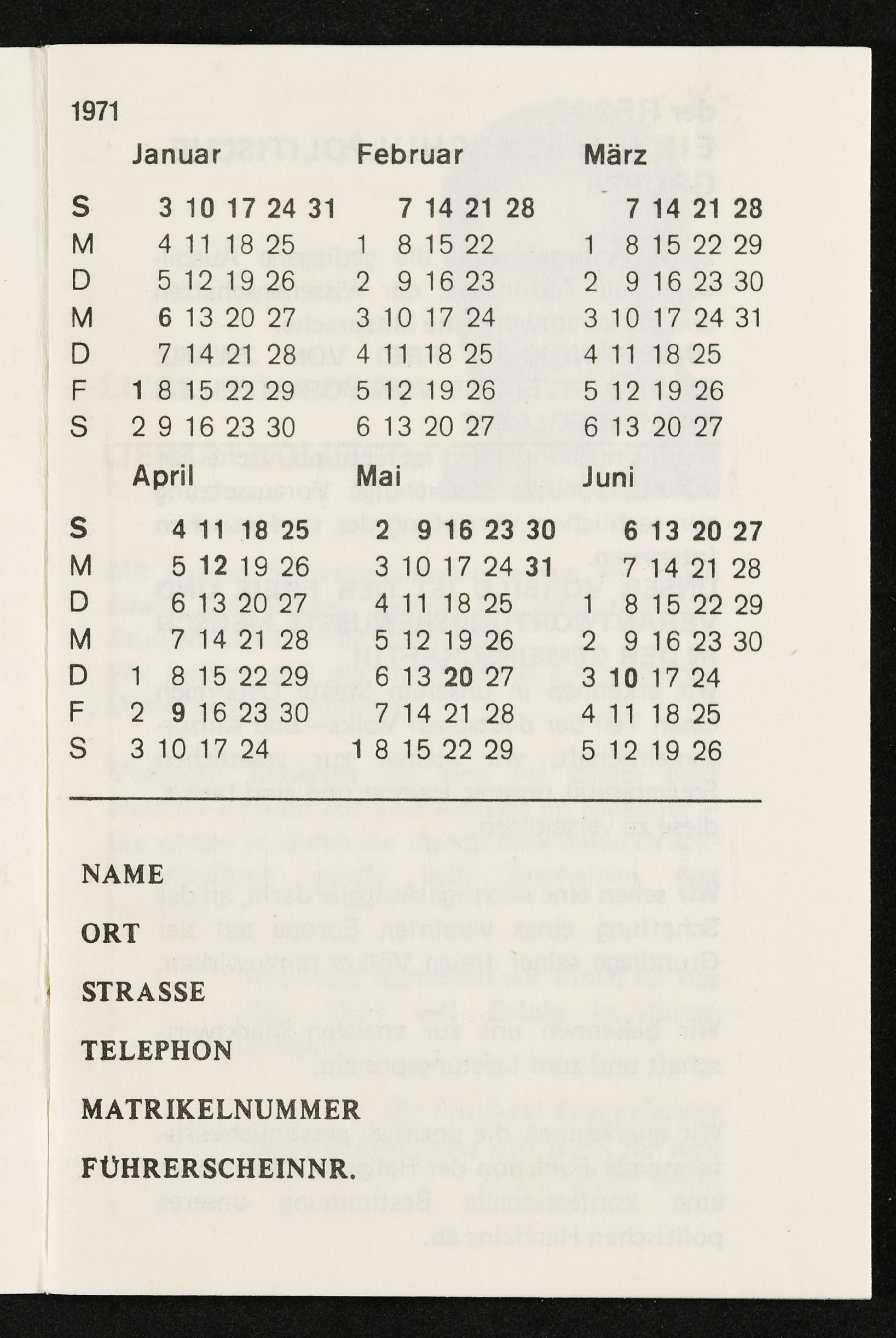 | Beschreibung | Studentenkalender Sommersemester 1971, Blatt 1 Vorderseite |