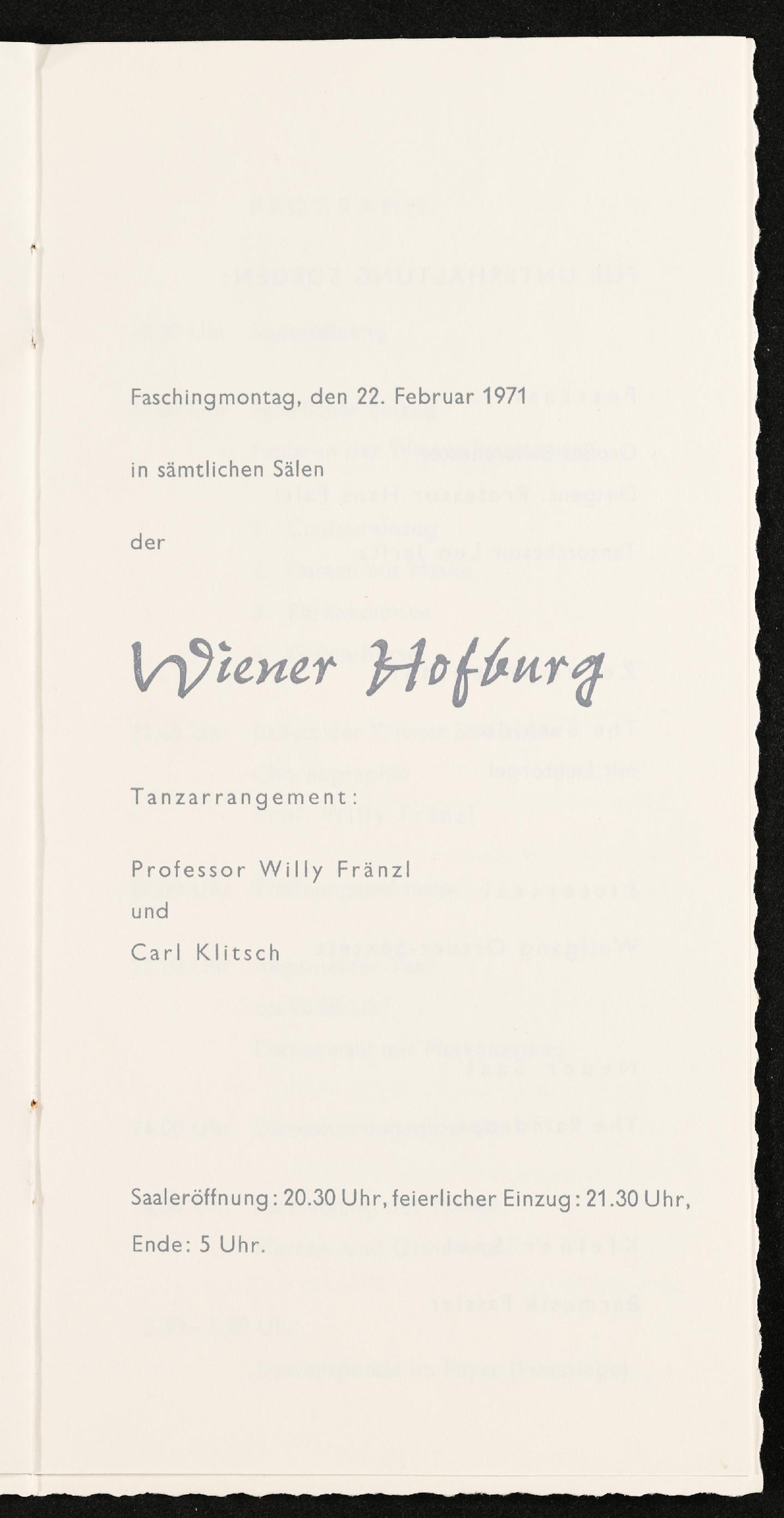 | Beschreibung | Blatt 5 Vorderseite. Einladung zur Rudolfina Redoute 1971 am Faschingmontag, den 22. Februar 1971. |