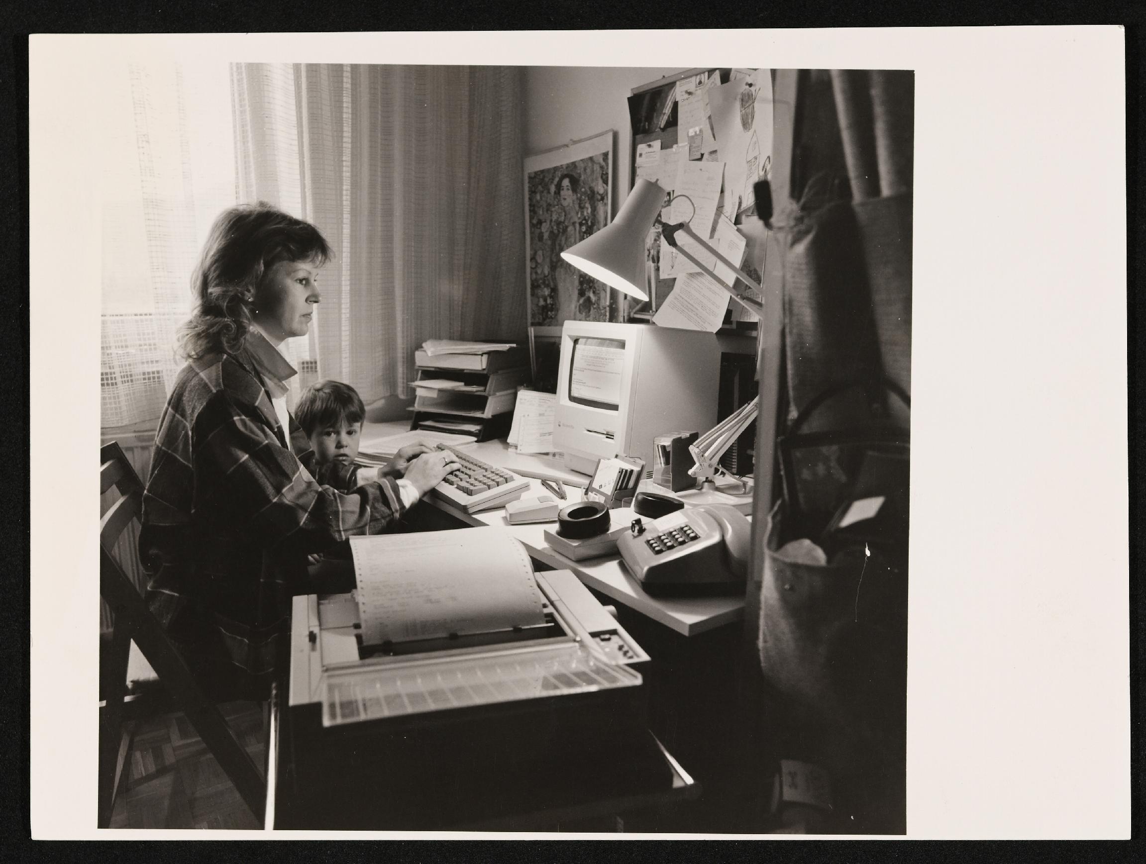 | Beschreibung | Angestellte mit Kind bei ihrer Büroarbeit am Computer |