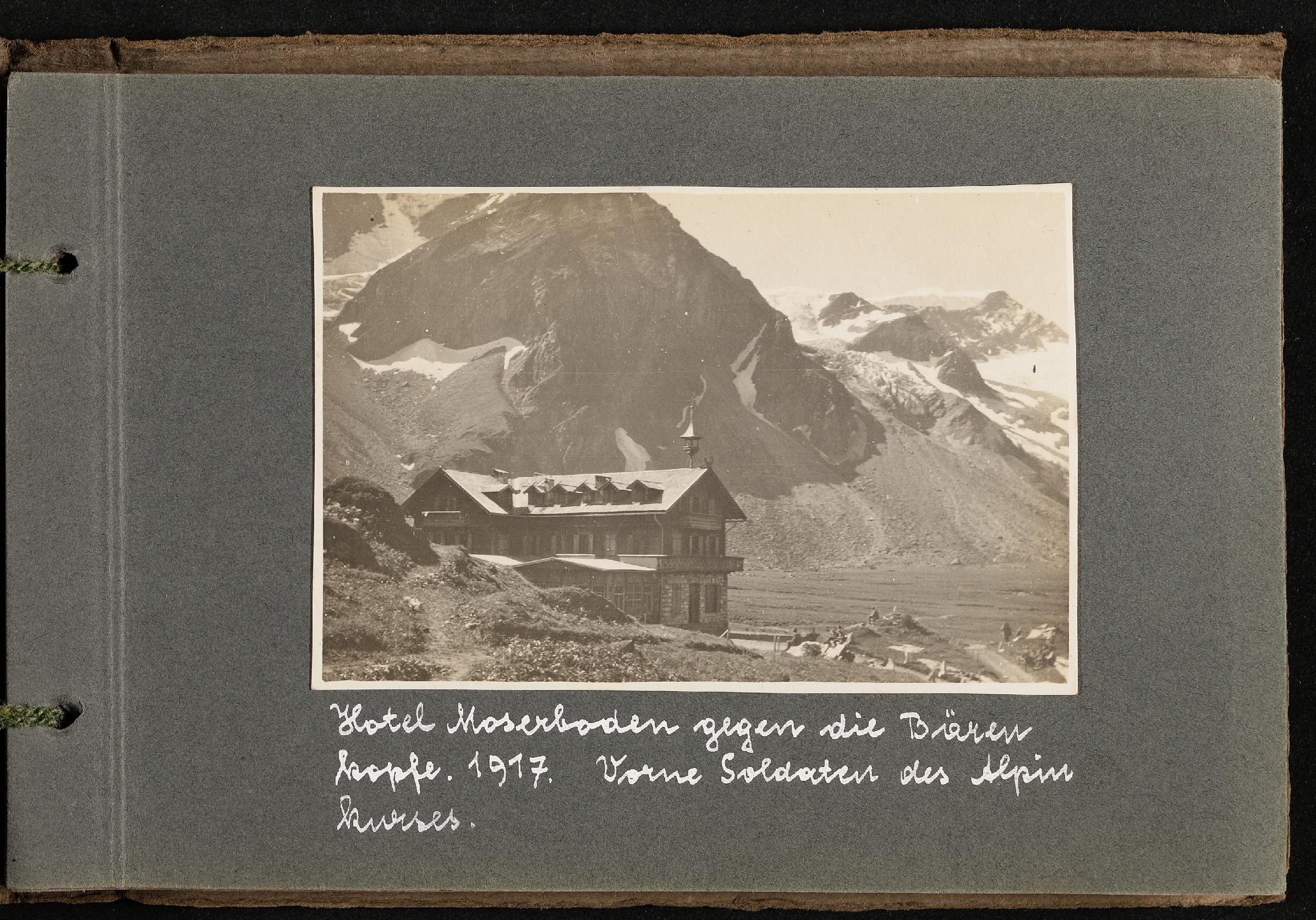 | Beschreibung | Fotoalbum von Ludwig Pullirsch, Blatt 3. Hotel Moserboden (richtige Schreibweise: Mooserboden) mit Blick gegen die Bärenkopfe. Vorne Soldaten des Alpinkurses. |