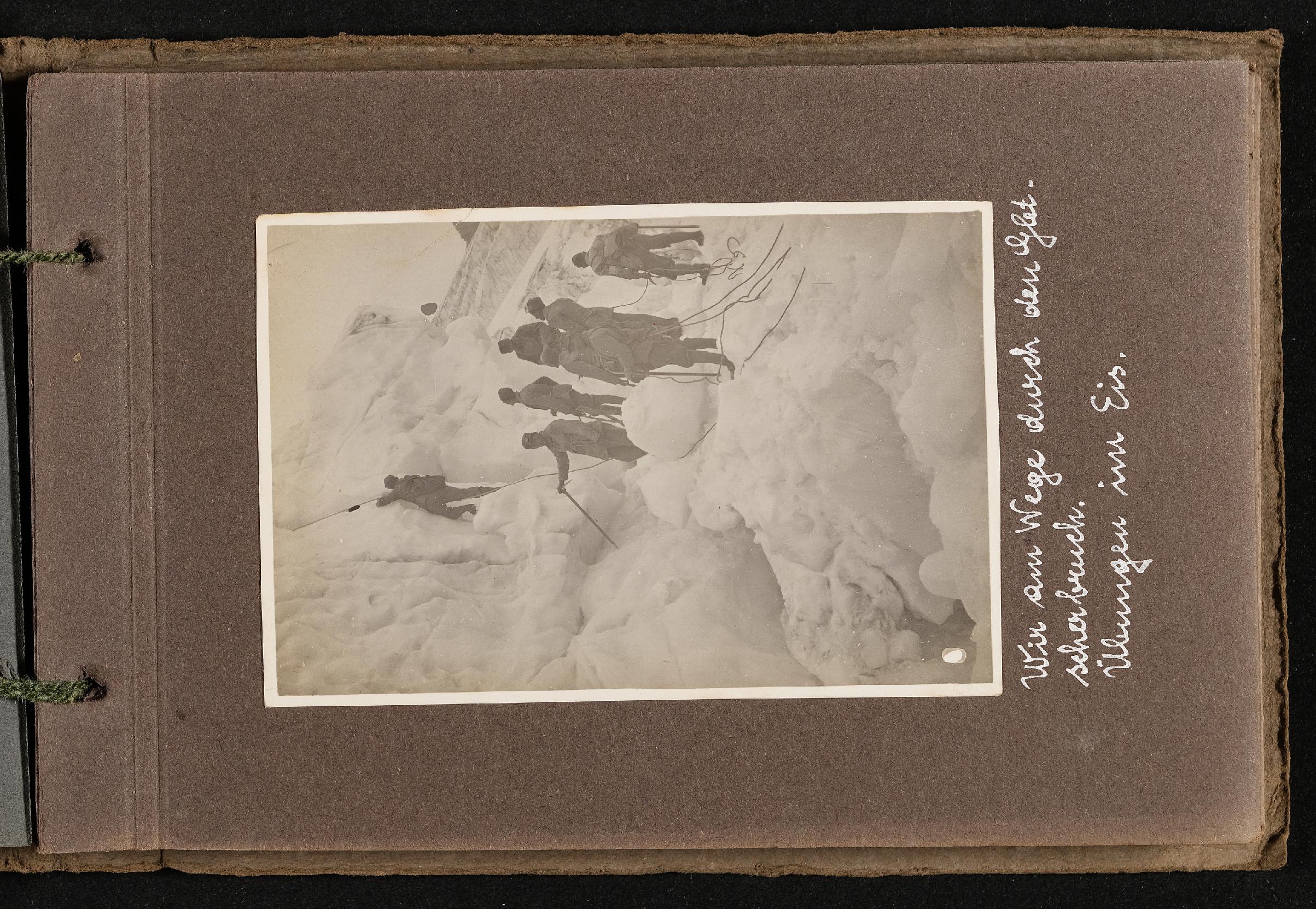 | Beschreibung | Fotoalbum von Ludwig Pullirsch, Blatt 8. Am Weg durch den Gletscherbruch |
