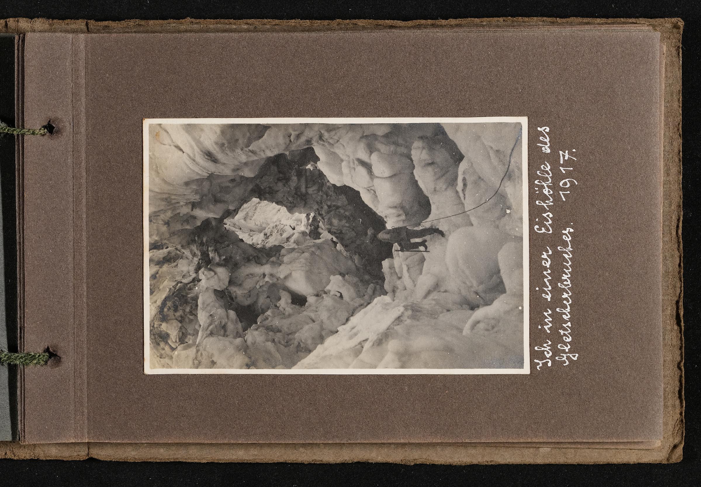 | Beschreibung | Fotoalbum von Ludwig Pullirsch, Blatt 12. In einer Eishöhle des Gletscherbruches |