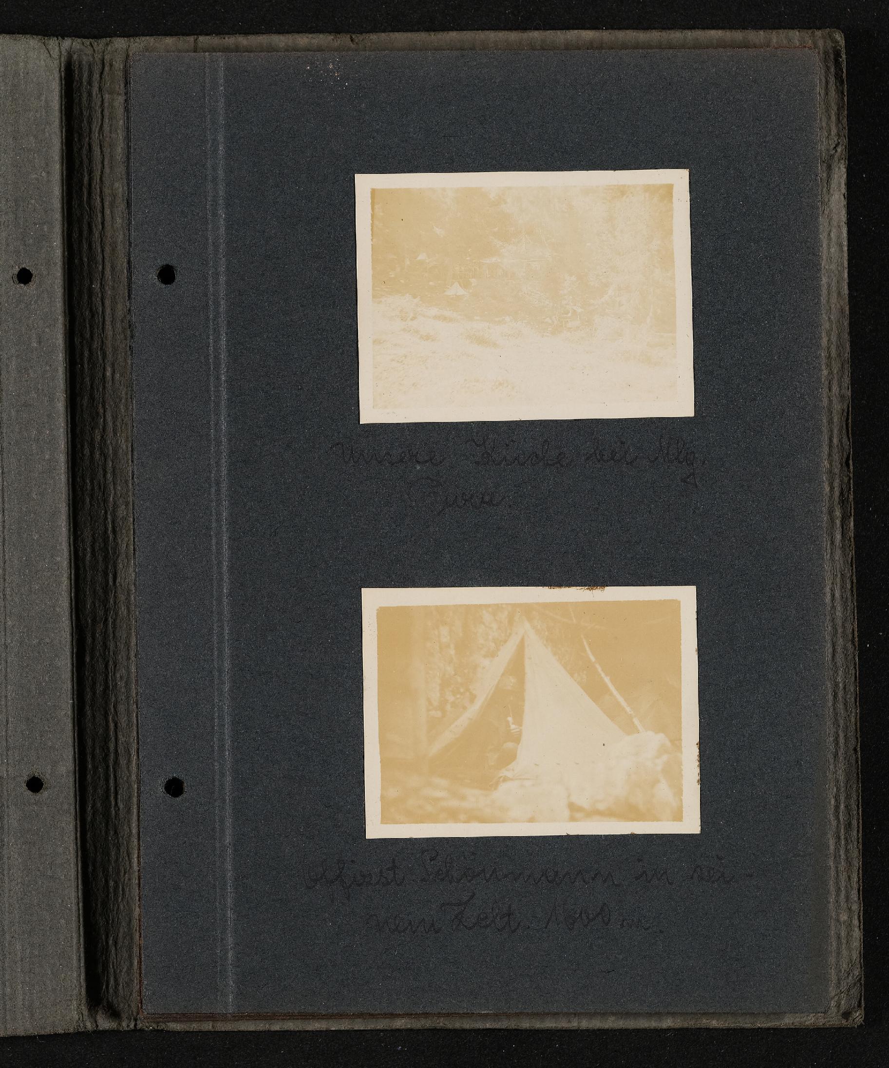 | Beschreibung | Fotoalbum FRONT 1918 von Ludwig Pullirsch, Blatt 7. Bild oben: unsere Küche bei Malga Pura. Bild unten: Schönmann in seinem Zelt 1600m |