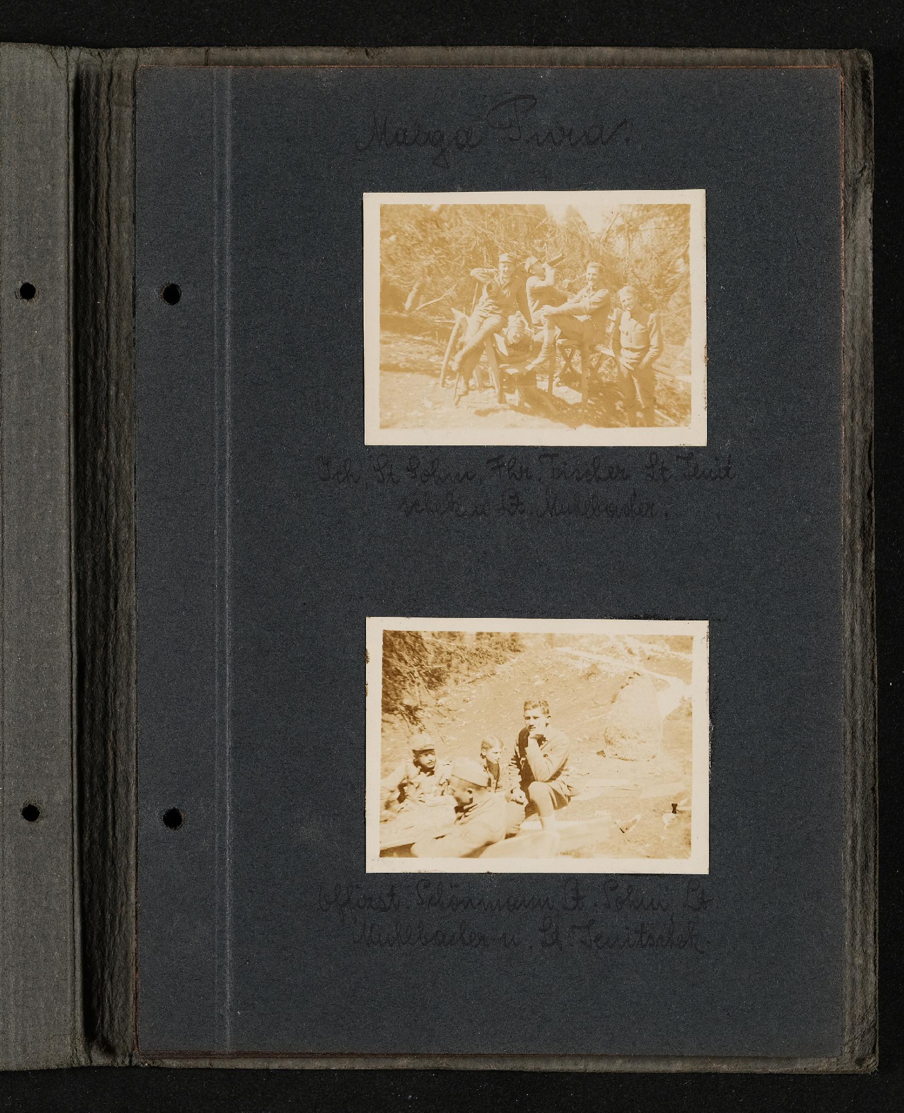 | Beschreibung | Fotoalbum FRONT 1918 von Ludwig Pullirsch, Blatt 9. Malga Pura, Foto oben: Pullirsch, Lohm, Tischer, Tenitschek, Mühlbacher, Foto unten: Schönmann, Lohm, Mühlbacher und Tenitschek |