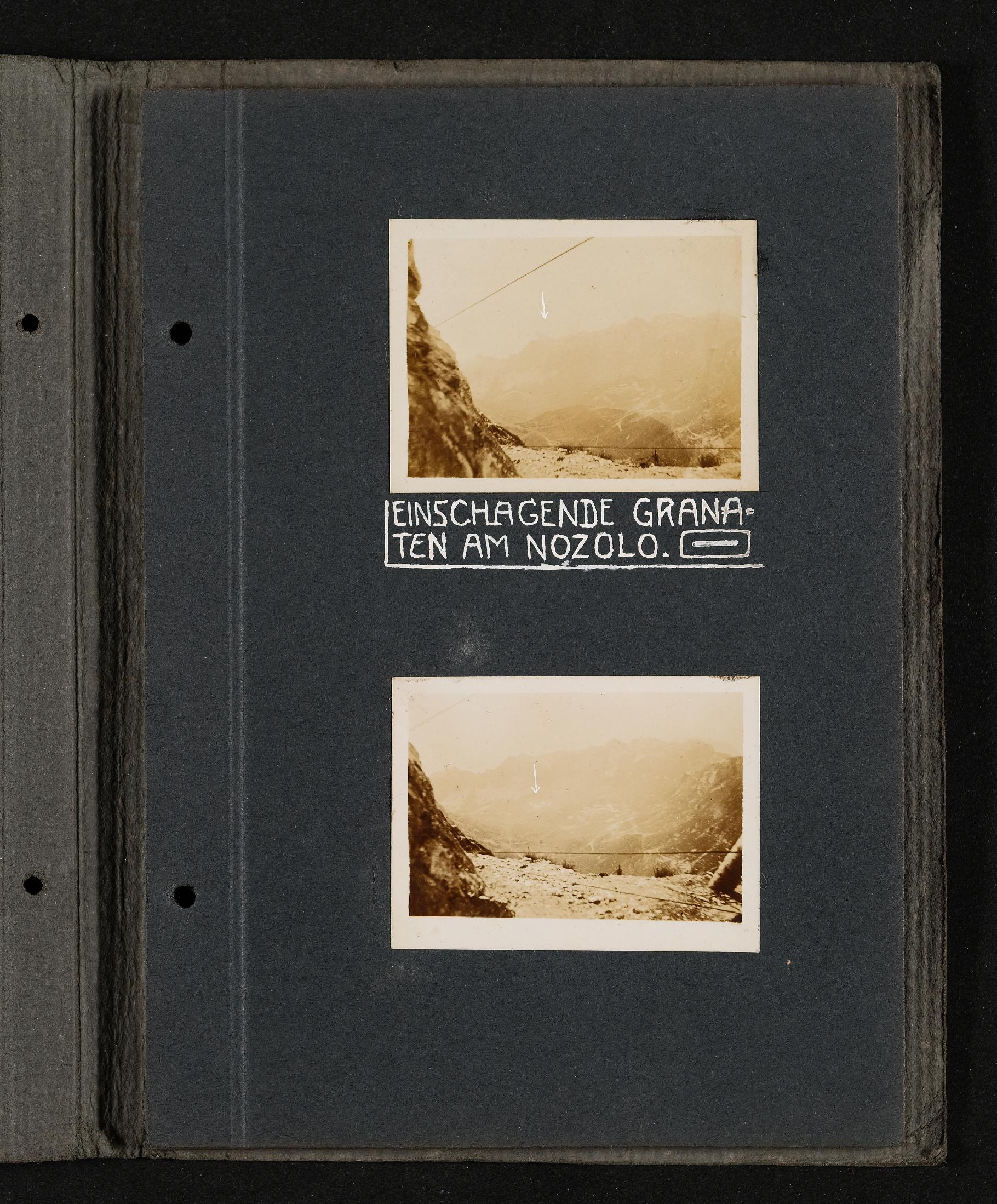 | Beschreibung | Fotoalbum FRONT 1918 von Ludwig Pullirsch, Blatt 13. Zwei Fotos: Einschlagende Granaten am Nozzolo |