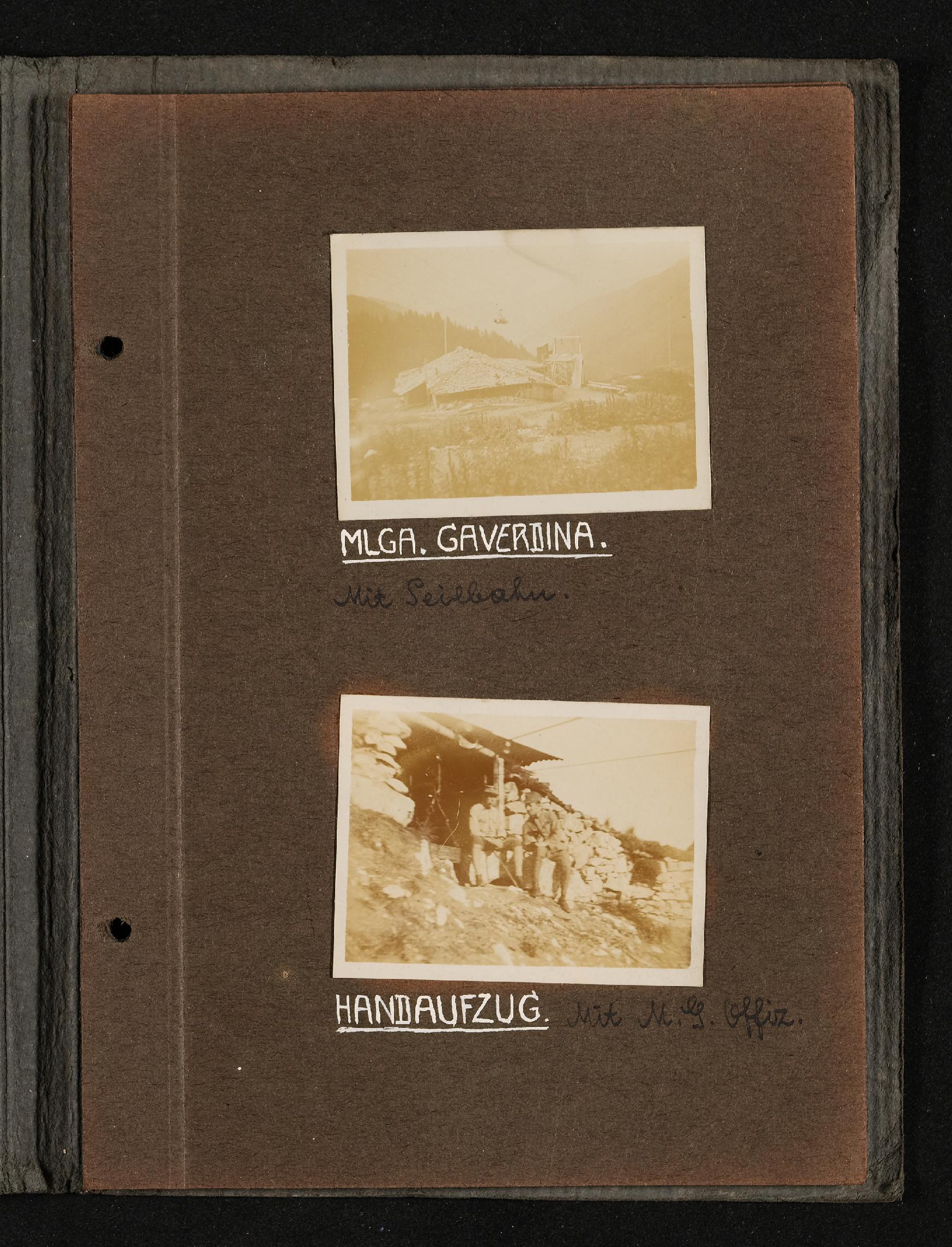 | Beschreibung | Fotoalbum FRONT 1918 von Ludwig Pullirsch, Blatt 16. Foto oben: MLGA Gaverdina mit Seilbahn, Bild unten: Handaufzug mit Maschinengewehr Offizieren |