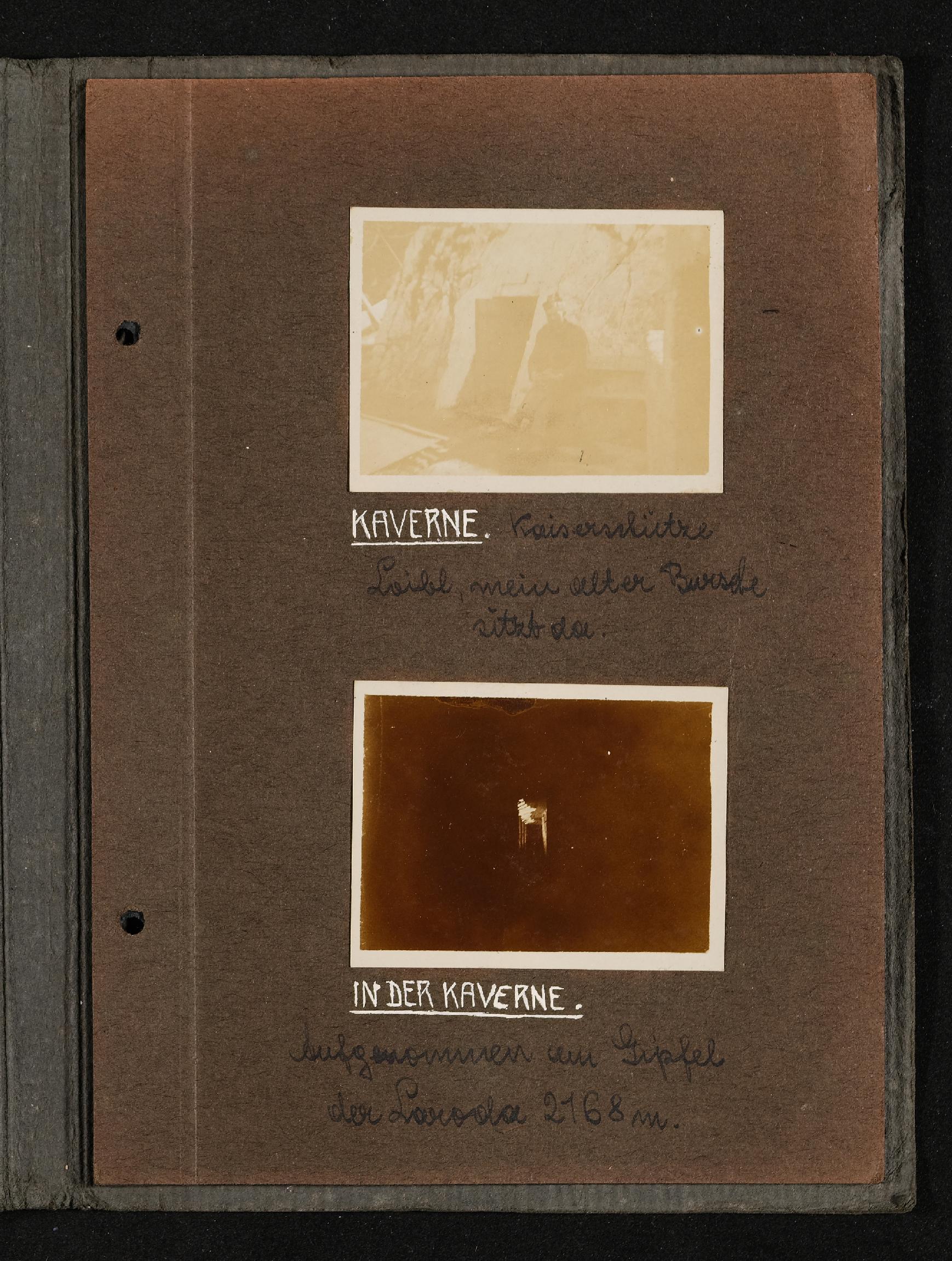 | Beschreibung | Fotoalbum FRONT 1918 von Ludwig Pullirsc, Blatt 19. Foto oben: Kaverne - Kaiserschütze Loibl, Foto unten: In der Kaverne |