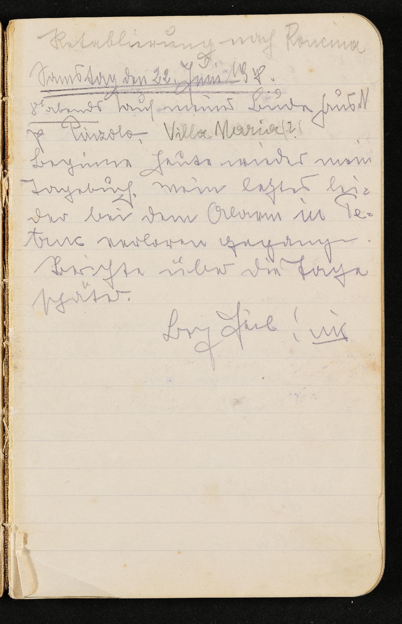 | Beschreibung | Notizbuch von Ludwig Pullirsch, Eintrag: Retablierung nach Roncina, Samstag, den 22. Juni 1918, Seite 33 |