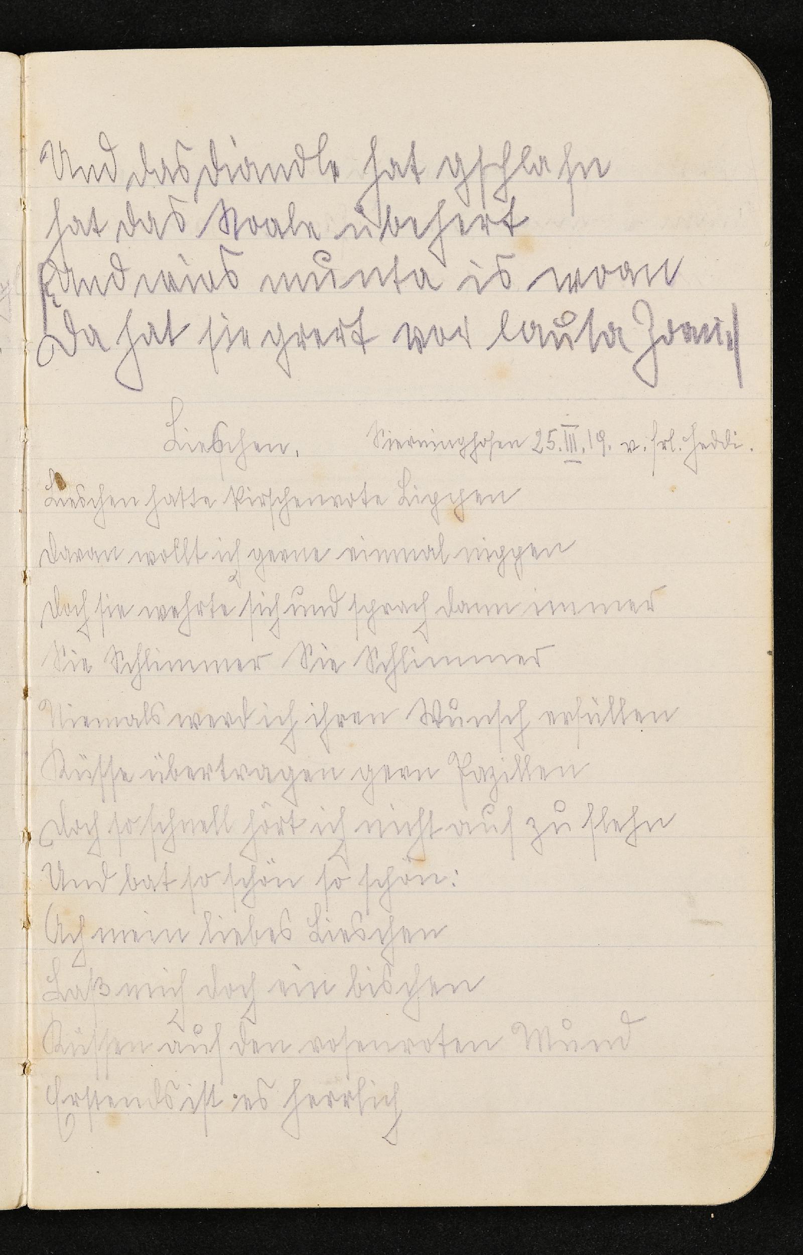 | Beschreibung | Notizbuch von Ludwig Pullirsch: Eintrag: Sierninghofen, 25. März 1919 mit Text "Liebchen", Seite 39 |