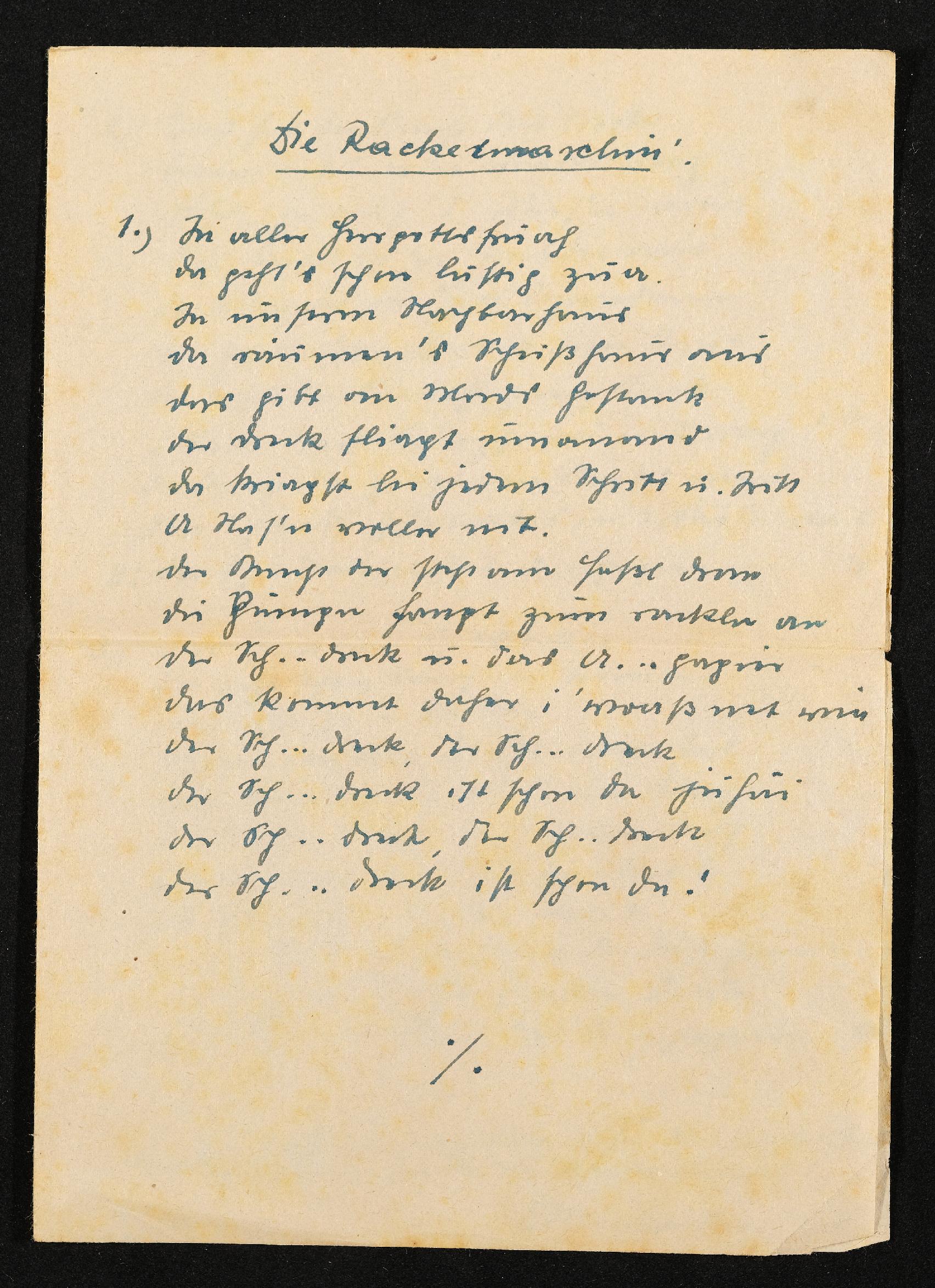 | Beschreibung | Eingelegtes Doppelblatt im Notizbuch von Ludwig Pullirsch, erste Seite des Textes "Die Racketmaschin' " - aufgezeichnet am 6. März 1941 |