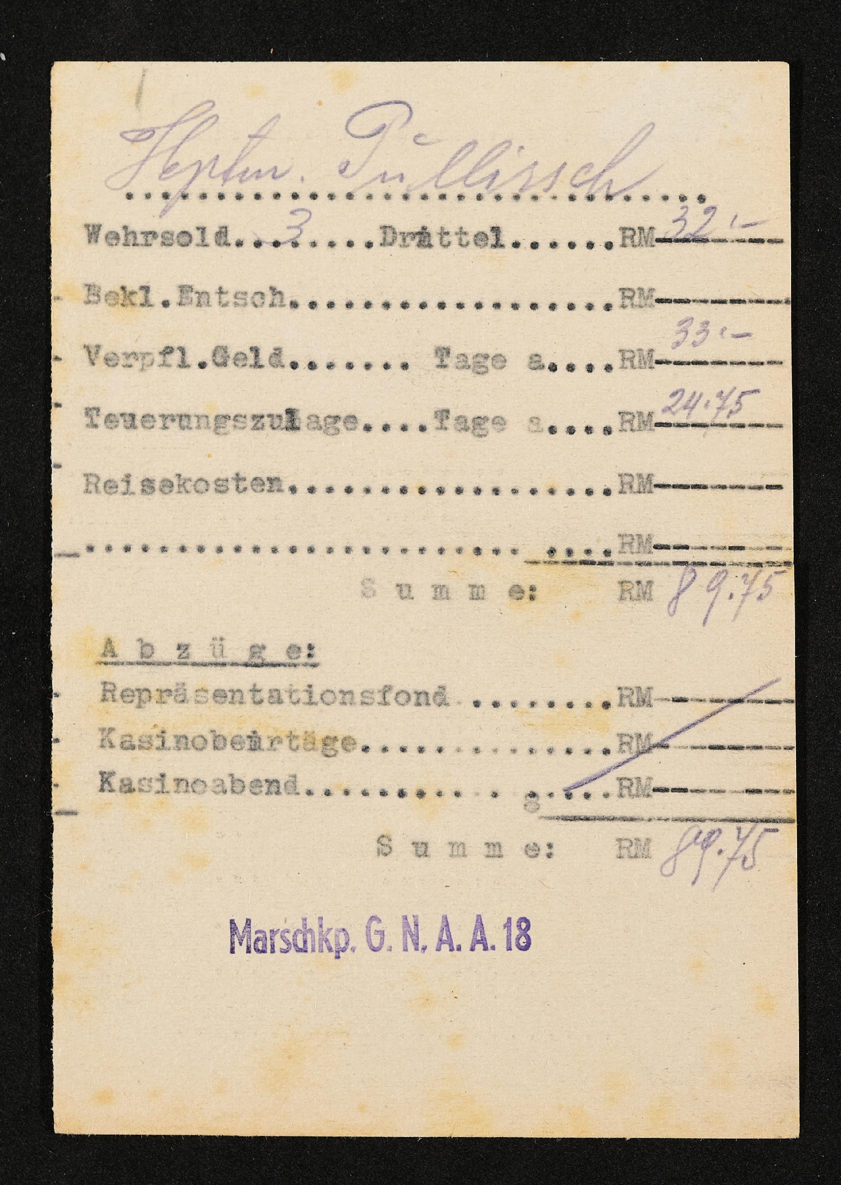 | Beschreibung | Eingelegtes Blatt im Notizbuch von Ludwig Pullirsch: Wehrsoldabrechung Hauptmann Ludwig Pullirsch |