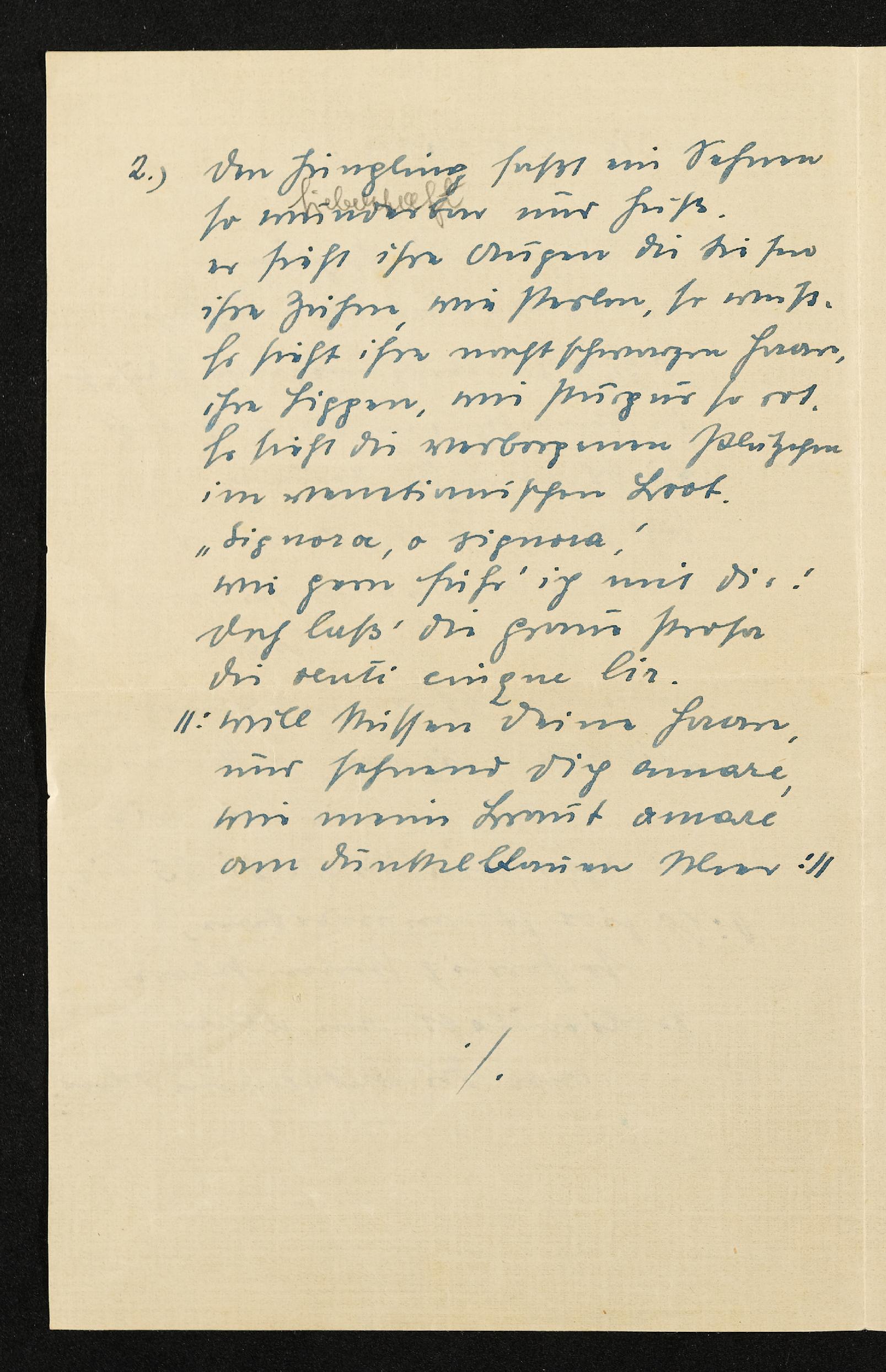 | Beschreibung | Eingelegtes Doppelblatt im Notizbuch von Ludwig Pullirsch, zweite Seite des Textes "Die Gondoliera" - aufgezeichnet am 6. März 1941 |