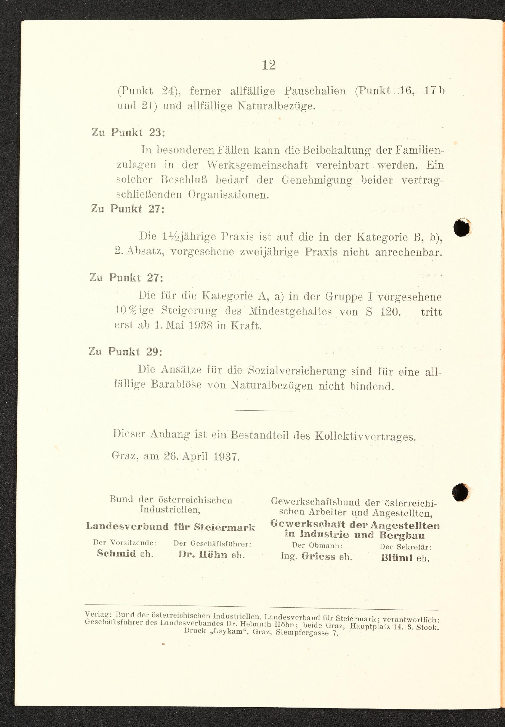 | Beschreibung | Kollektivvertrag vom 26. April 1937, abgeschlossen zwischen dem Bund der österreichischen Industriellen, Landesverband Steiermark und ÖGB |