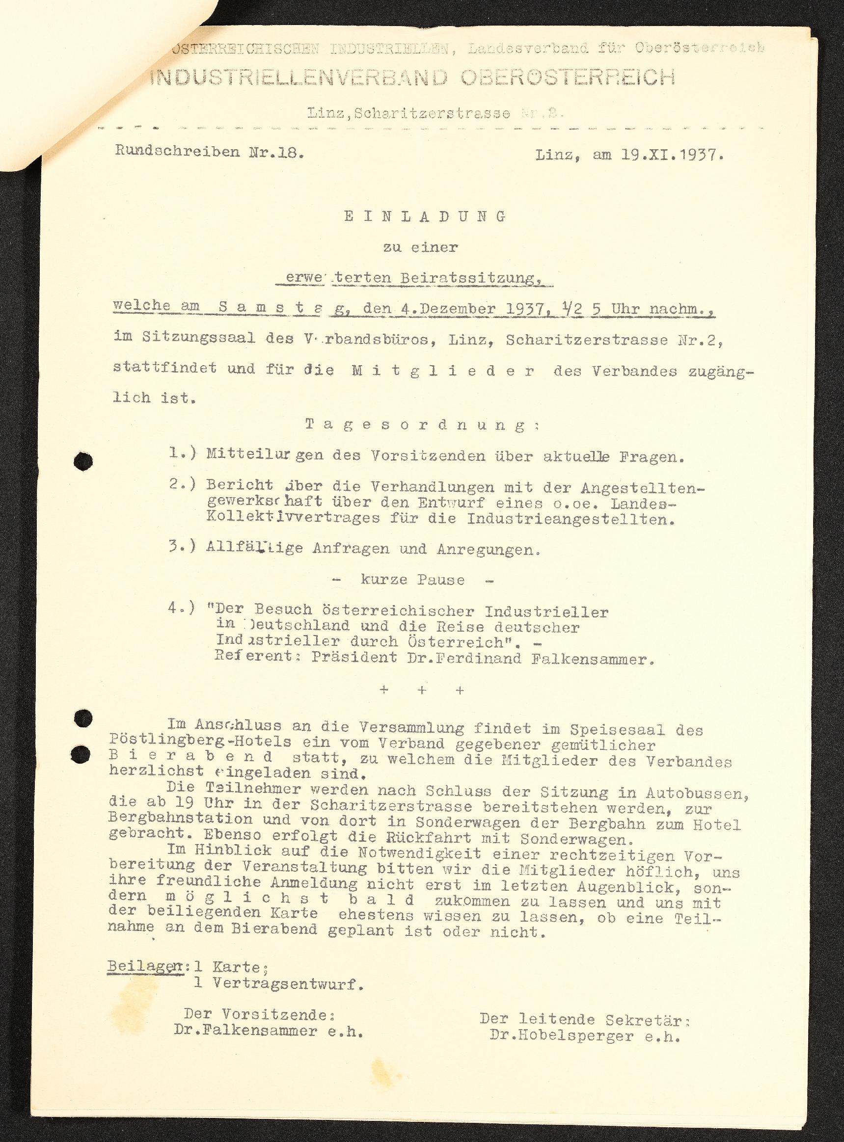 | Beschreibung | Rundschreiben Nr. 18, Bund der Österreichischen Industriellen, Landesverband für Oberösterreich, Einladung zu einer erweiterten Beiratssitzung, Linz am 19. November 1937 |