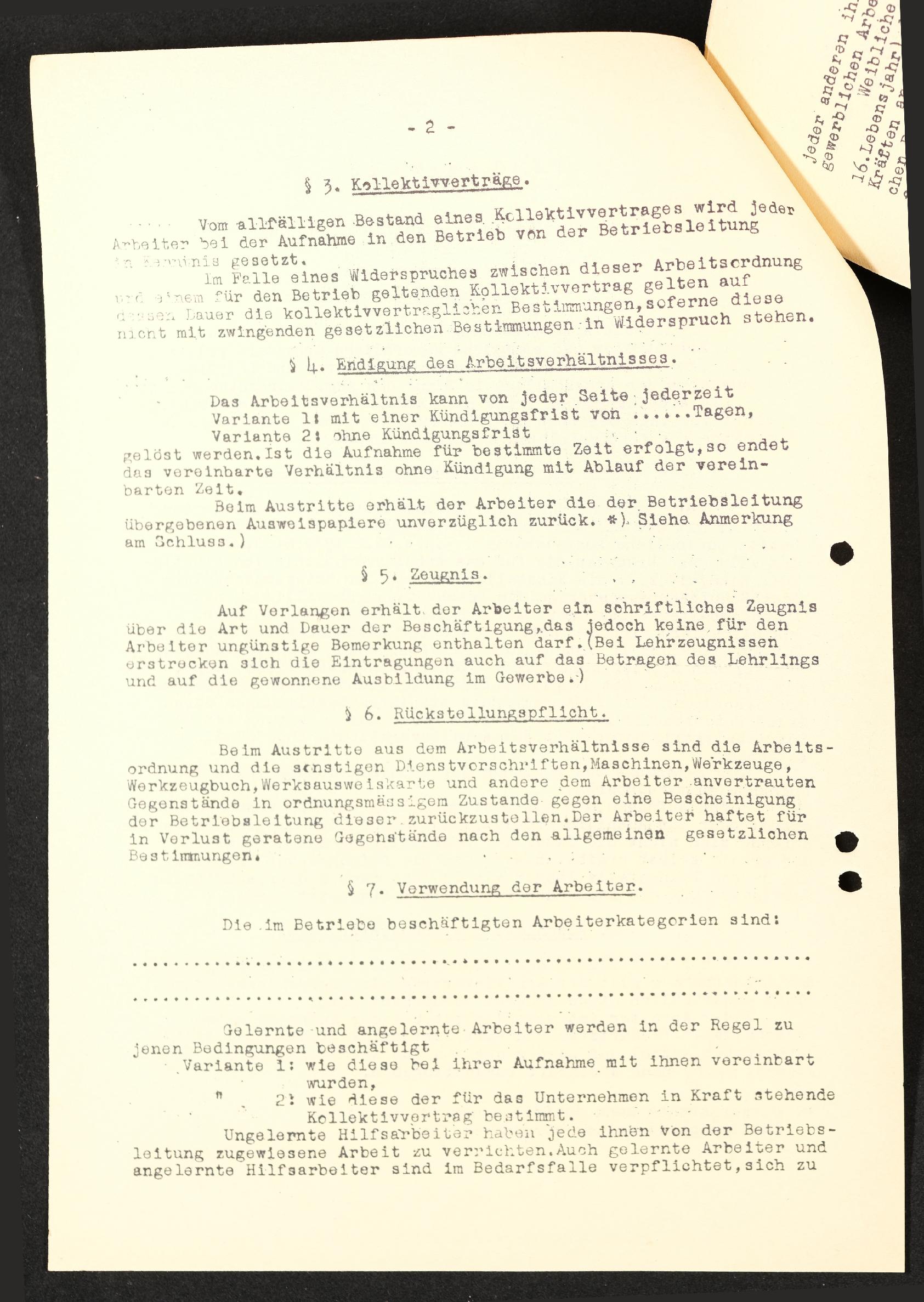 | Beschreibung | Arbeitsordnung, Seite2, §3. Kollektivvertrag, §4. Endigung des Arbeitsverhältnises, §5. Zeugnis, §6. Rückstellungspflicht, §7. Verwendung der Arbeiter |
