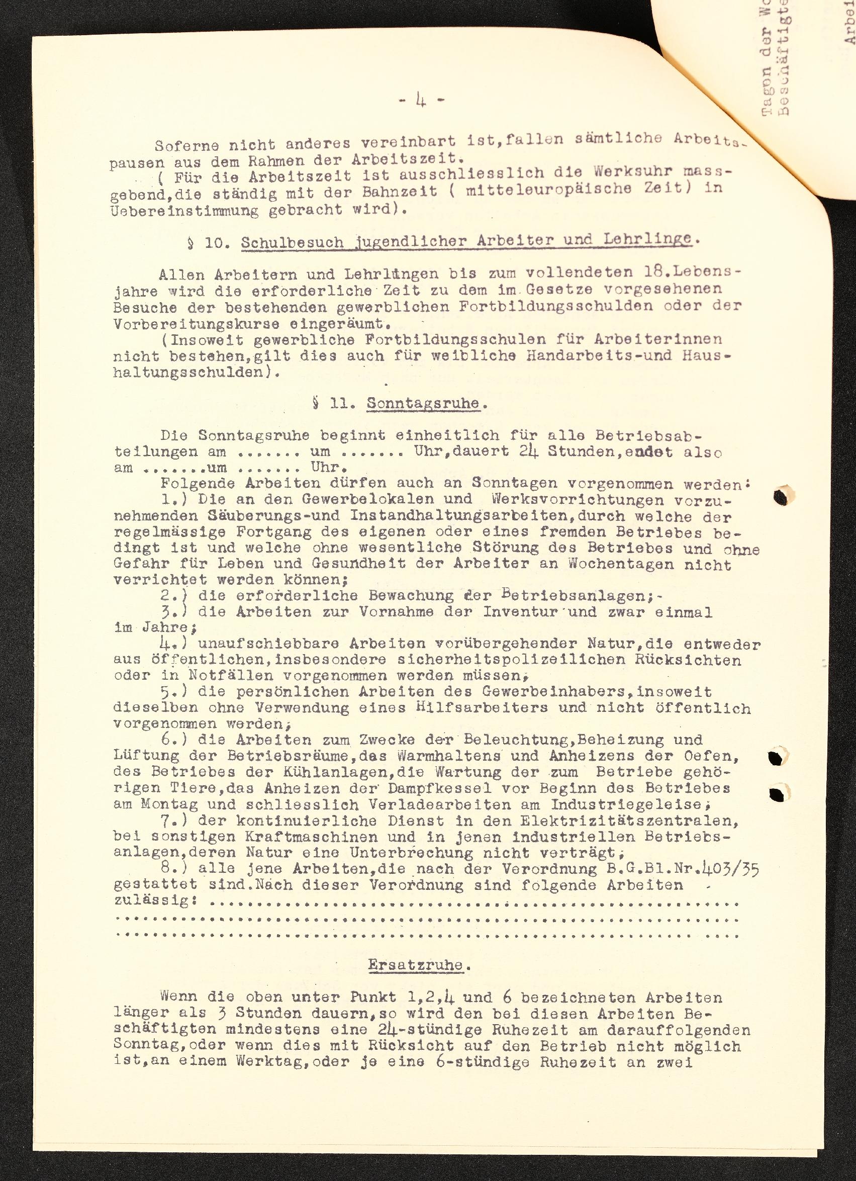 | Beschreibung | Arbeitsordnung, Seite 4, § 9 fortführend, §10. Schulbesuch jugendlicher Arbeiter u Lehrlinge, §11. Sonntagsruhe |