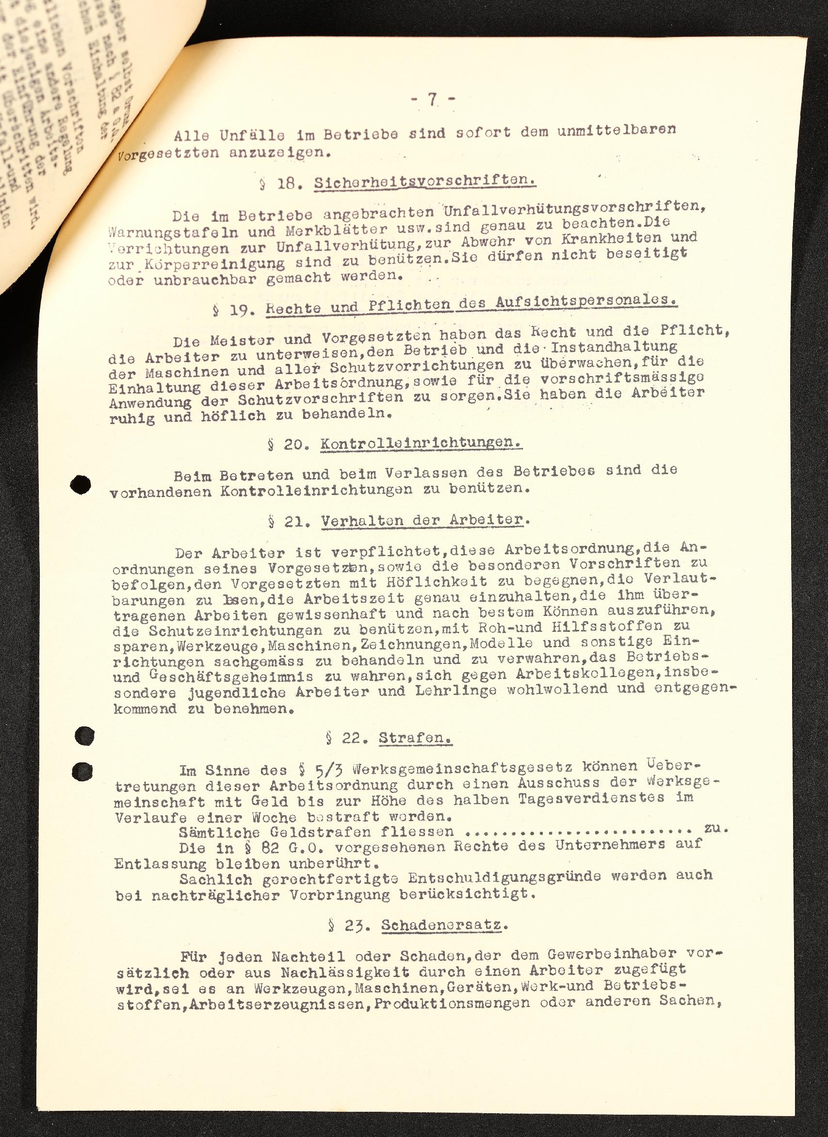 | Beschreibung | Arbeitsordnung, Seite 6, §13 fortfühend, §14. Lohnzettel, §15. Geltendmachung von Ansprüchen aus dem Arbeitsverhältnis, §16. Stücklohn (Akkordlohn), §17. Versicherungspflicht |