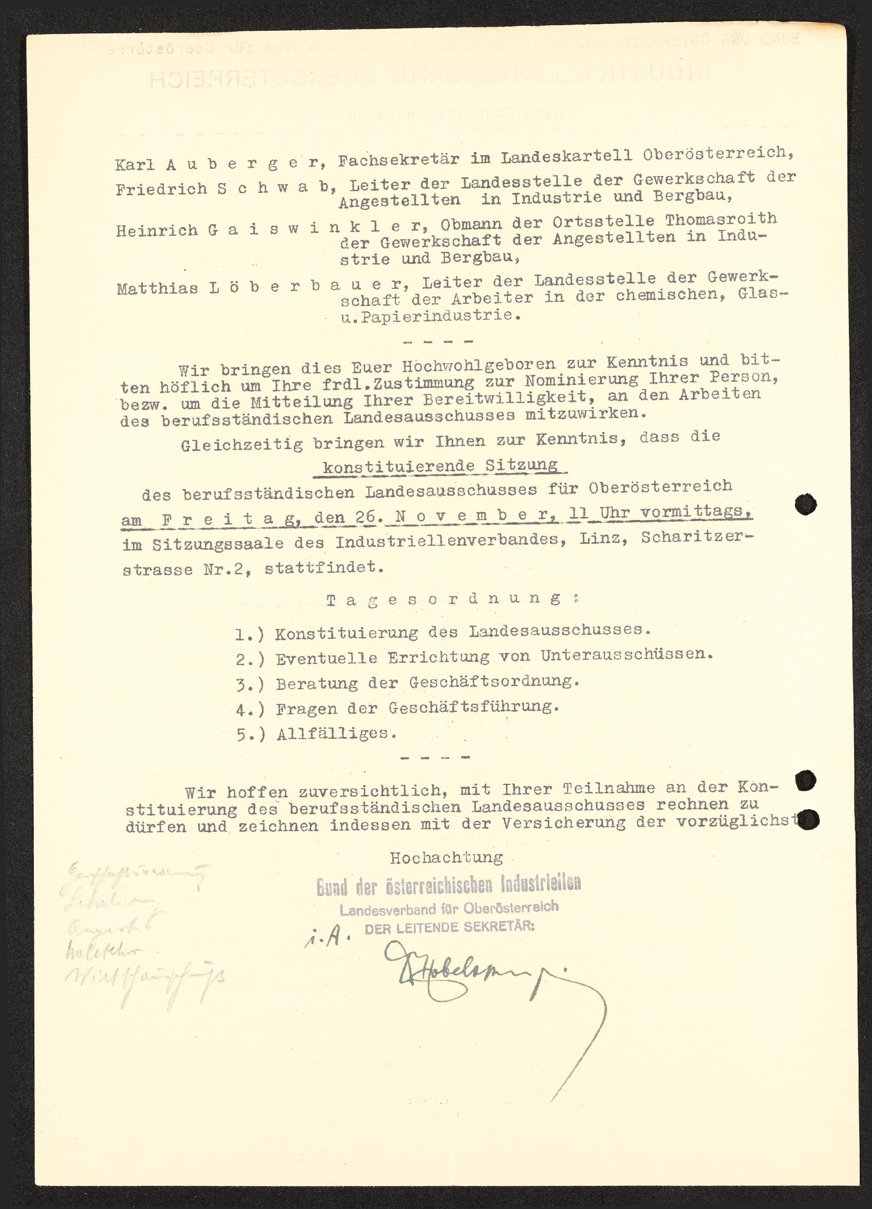 | Beschreibung | Schreiben an Berufsständischen Landesausschuss, Bund der österreichischen Industriellen Landesverband für Oberösterriech, Linz am 19. November 1937 |