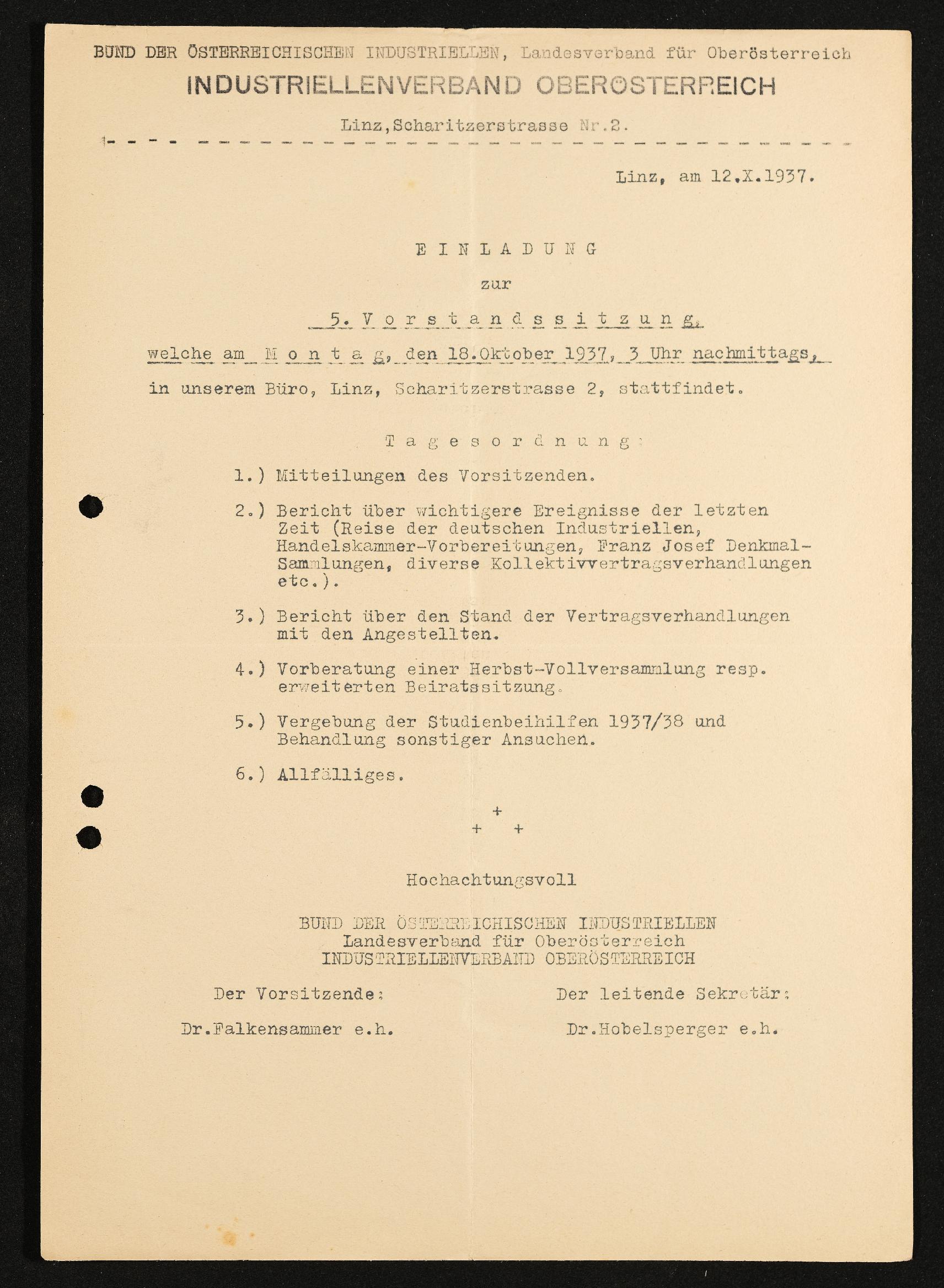 | Beschreibung | Einladung zur fünften Vorstandssitzung, Linz 12. Oktober 1937, Bund der österreichischen Industriellen Landesverband für Oberösterriech, Industriellenverband Oberösterreich |