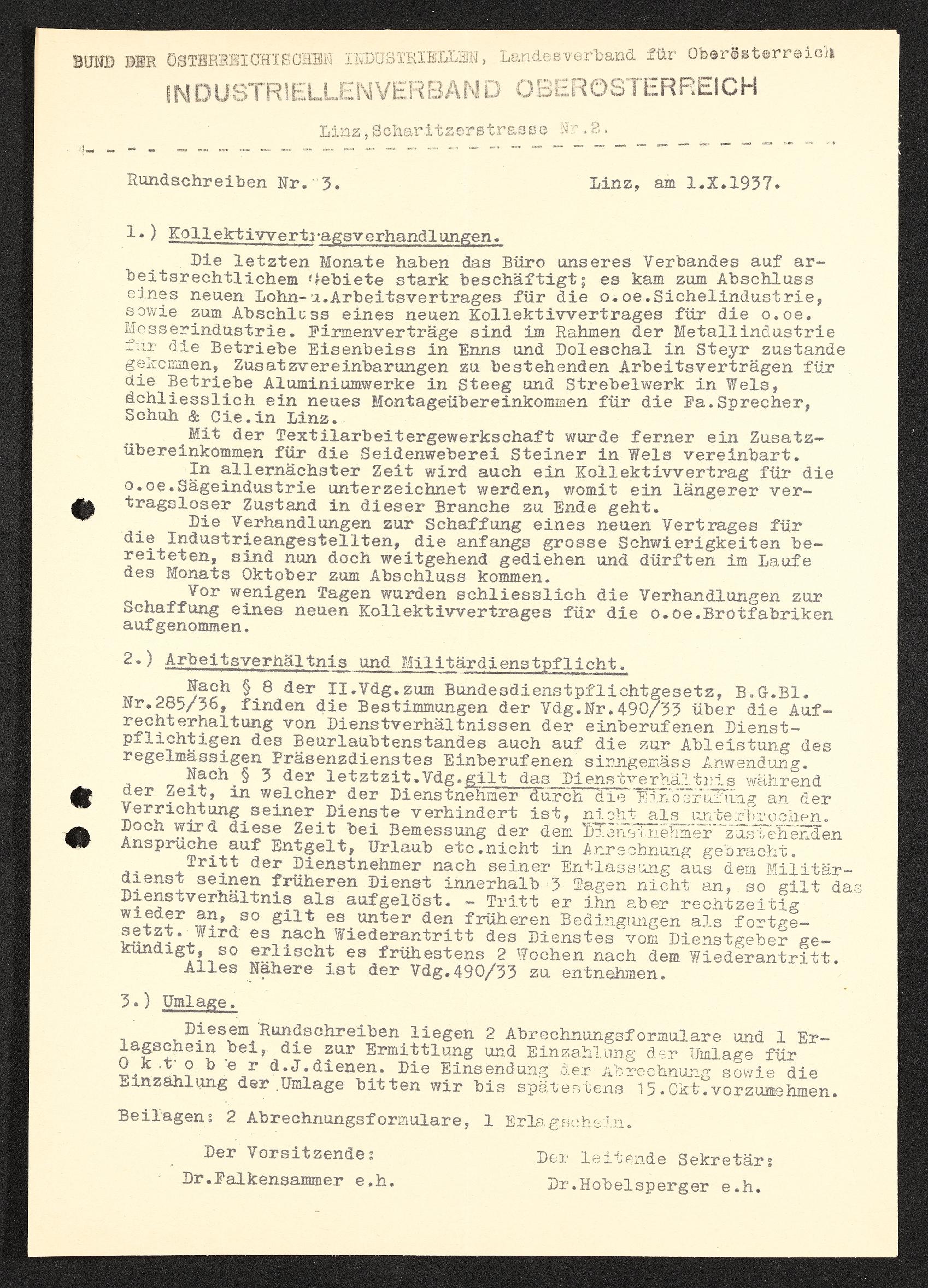 | Beschreibung | Rundschreiben Nr. 3, Kollektivvertrag, Linz 1. Oktober 1937, Bund der österreichischen Industriellen Landesverband für Oberösterriech, Industriellenverband Oberösterreich |